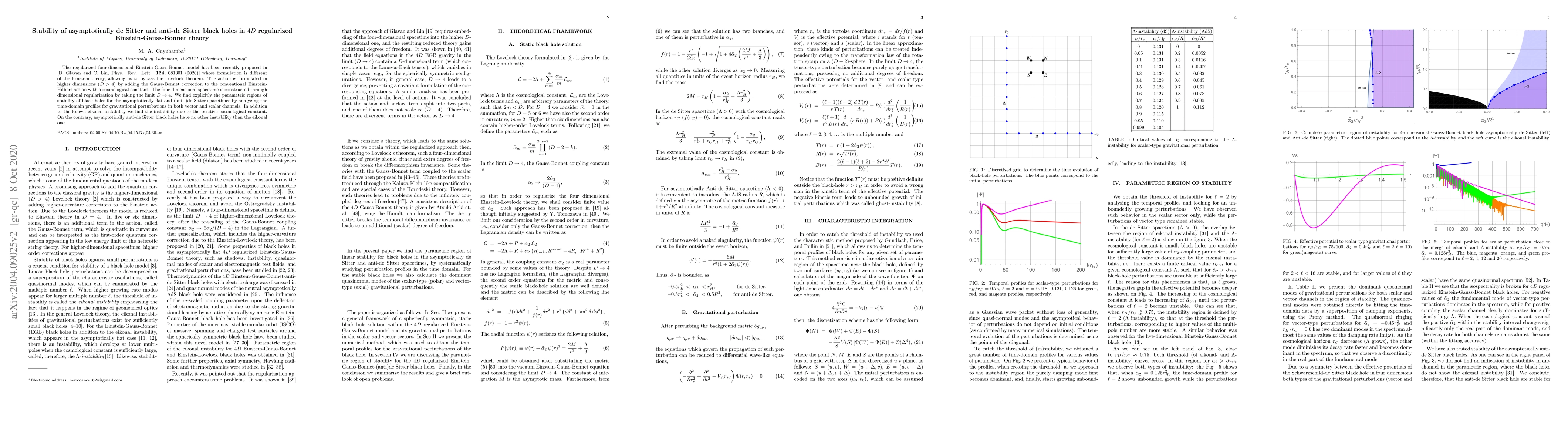 This paper investigates the stability of black holes in a regularized four-dimensional Einstein-Gauss-Bonnet theory, finding that asymptotically de Sitter black holes exhibit an additional instability due to the positive cosmological constant, while asymptotically anti-de Sitter black holes only show the eikonal instability.