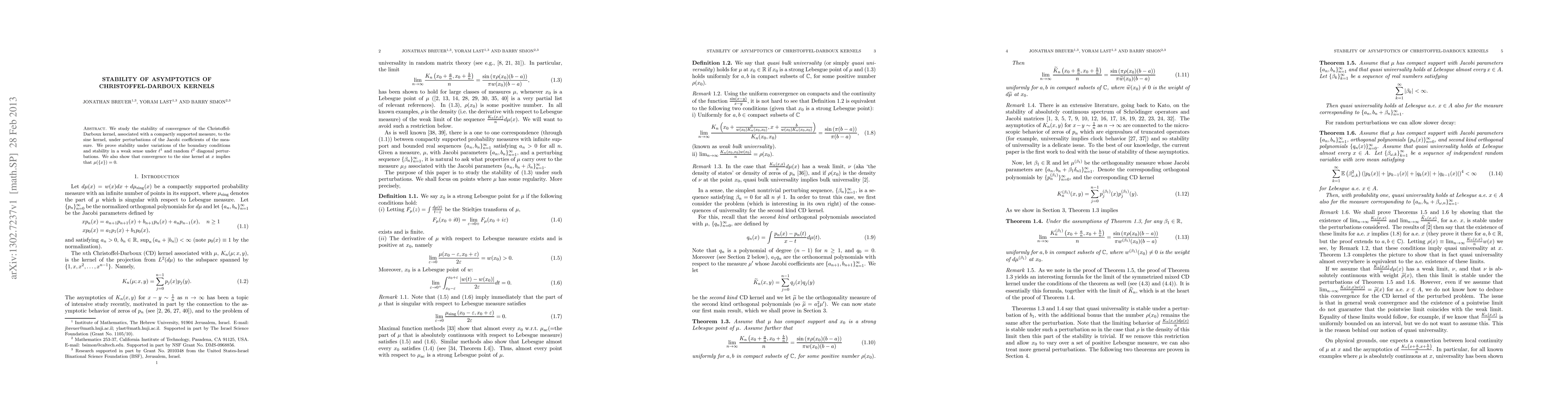 This paper investigates the stability of the convergence of Christoffel-Darboux kernels to the sine kernel under perturbations of Jacobi coefficients, proving stability under boundary condition variations and weak stability under $\ell^1$ and random $\ell^2$ diagonal perturbations. It also establishes that convergence to the sine kernel at a point implies the measure has no point mass at that point.