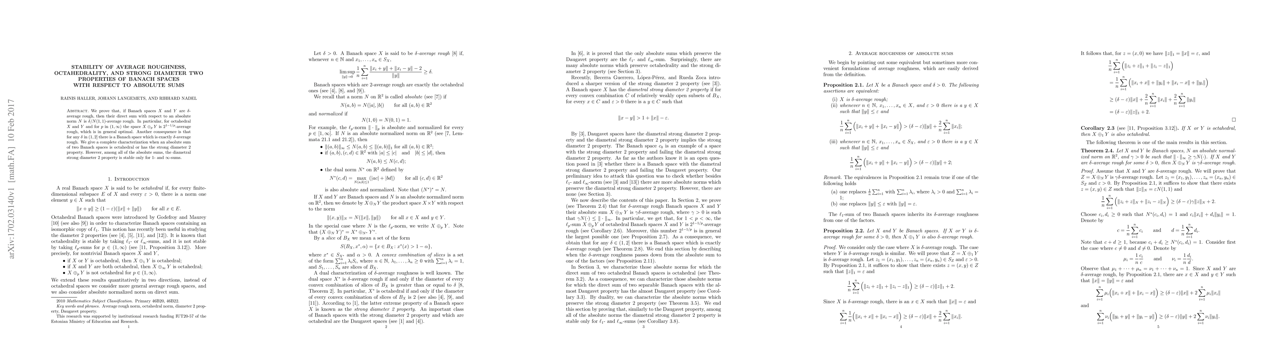 This paper investigates the stability of average roughness, octahedrality, and strong diameter 2 properties in Banach spaces under absolute sums. It proves that $\delta$-average rough spaces maintain their property under such sums, with specific results for octahedral spaces and optimal average roughness values.