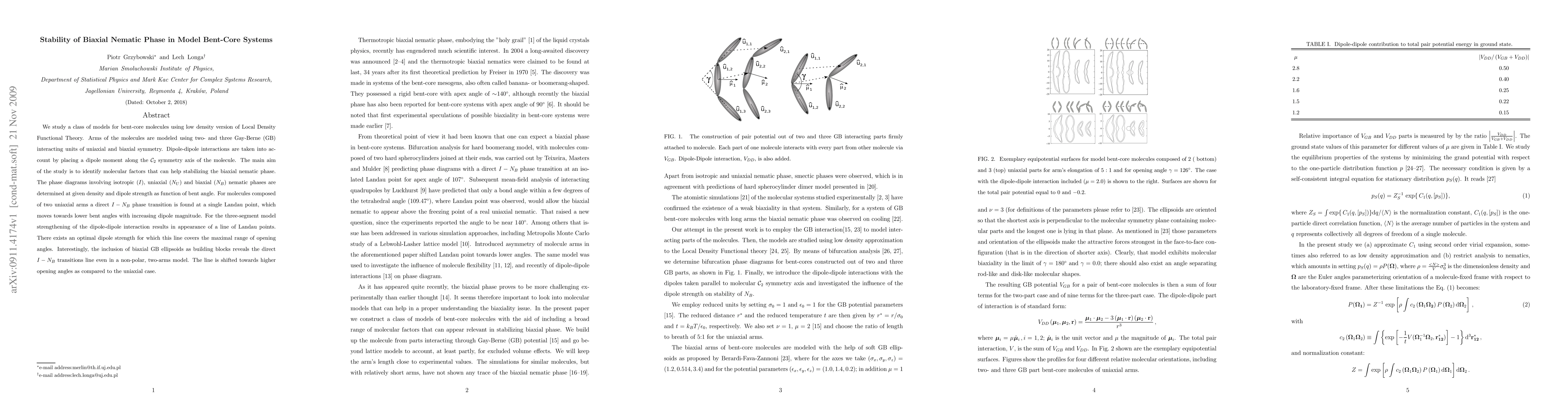 We study a class of models for \sbentcore molecules using low density version of Local Density Functional Theory. Arms of the molecules are modeled using two- and three Gay-Berne (GB) interacting units of uniaxial and biaxial symmetry. Dipole-dipole interactions are taken into account by placing a dipole moment along the ${\mathcal{C}}_2$symmetry axis of the molecule. The main aim of the study is to identify molecular factors that can help stabilizing the biaxial nematic phase. The phase diagrams involving isotropic ($I$), uniaxial ($N_U$) and biaxial ($N_B$) nematic phases are determined at given density and dipole strength as function of bent angle. For molecules composed of two uniaxial arms a direct $I-N_B$ phase transition is found at a single Landau point, which moves towards lower bent angles with increasing dipole magnitude. For the three-segment model strengthening of the dipole-dipole interaction results in appearance of a line of Landau points. There exists an optimal dipole strength for which this line covers the maximal range of opening angles. Interestingly, the inclusion of biaxial GB ellipsoids as building blocks reveals the direct $I-N_B$ transitions line even in a non-polar, two-arms model. The line is shifted towards higher opening angles as compared to the uniaxial case.