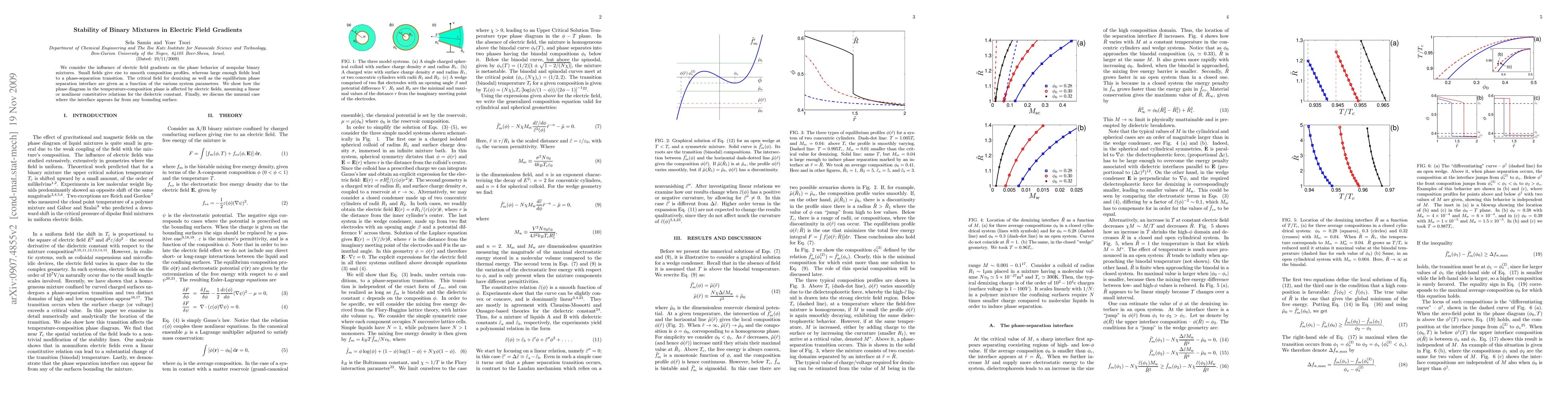 This paper investigates how electric field gradients affect the phase behavior of nonpolar binary mixtures, showing that small fields create smooth composition profiles while larger fields induce phase separation. The critical field for demixing and the phase separation interface are analyzed as functions of system parameters, with implications for the temperature-composition phase diagram under linear or nonlinear dielectric relations.
