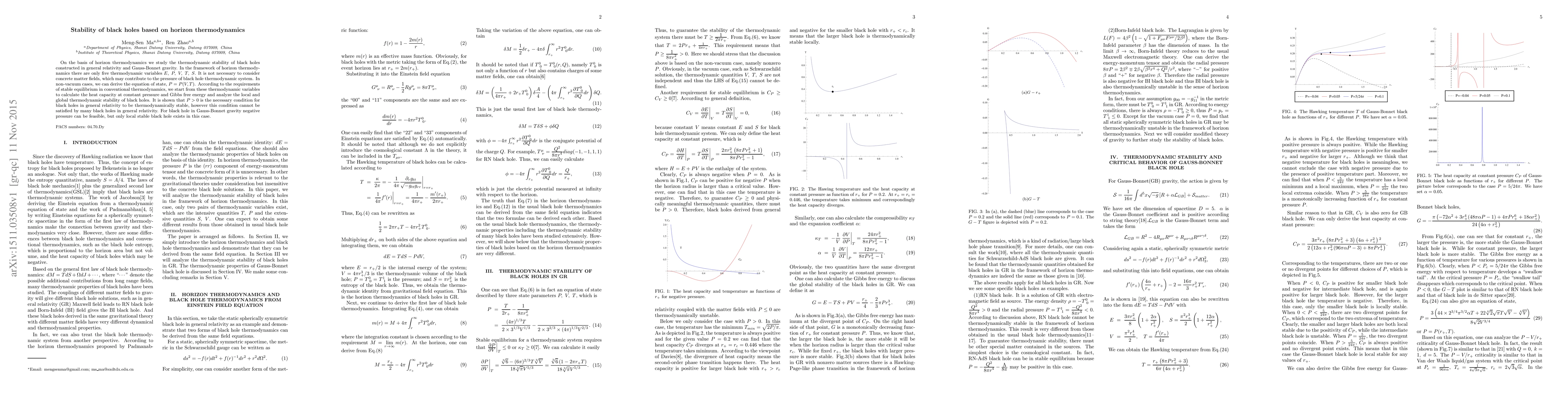 This paper investigates the thermodynamic stability of black holes using horizon thermodynamics, focusing on general relativity and Gauss-Bonnet gravity. It finds that positive pressure is necessary for thermodynamic stability in general relativity, but many black holes cannot meet this condition; in Gauss-Bonnet gravity, only locally stable black holes exist with feasible negative pressure.