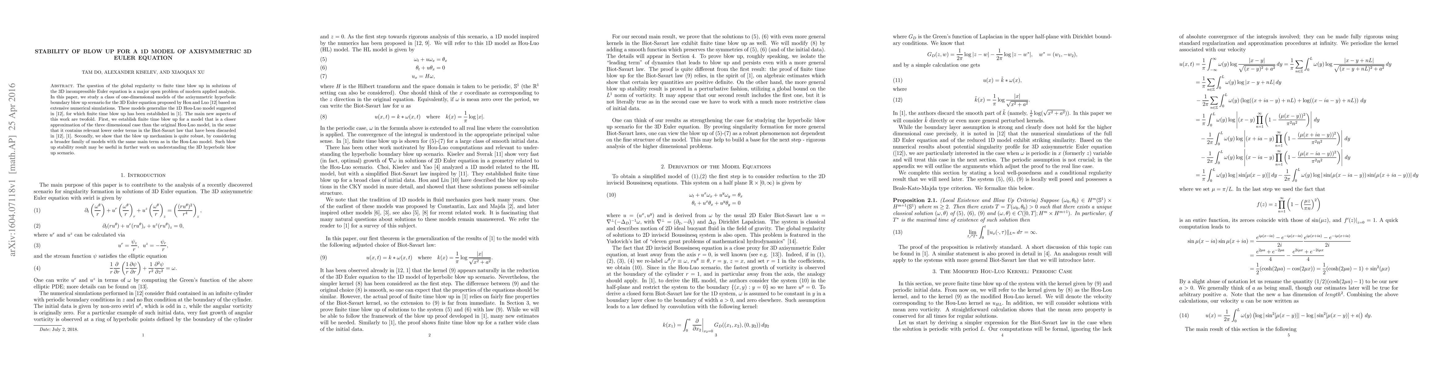 A new numerical approach was developed to solve the 1D model of the 3D axisymmetric Euler equations, which captures the finite-time blowup behavior accurately.