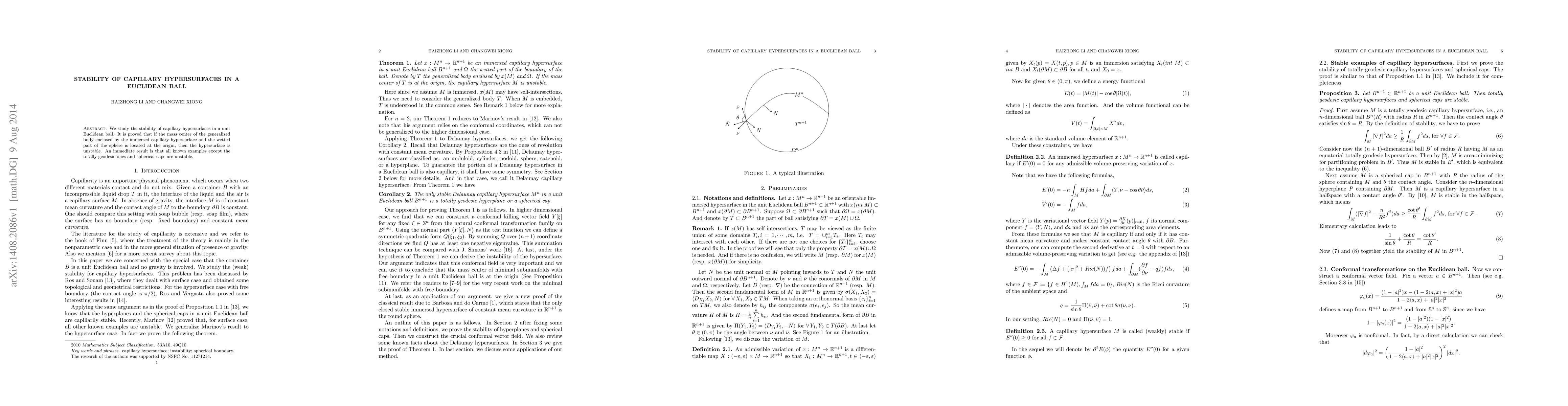 Summary: This paper investigates the stability of capillary hypersurfaces within a Euclidean ball, proving that if the mass center of the enclosed body and the wetted sphere part is at the origin, the hypersurface is unstable. It concludes that most known examples, except for geodesic and spherical caps, are unstable.