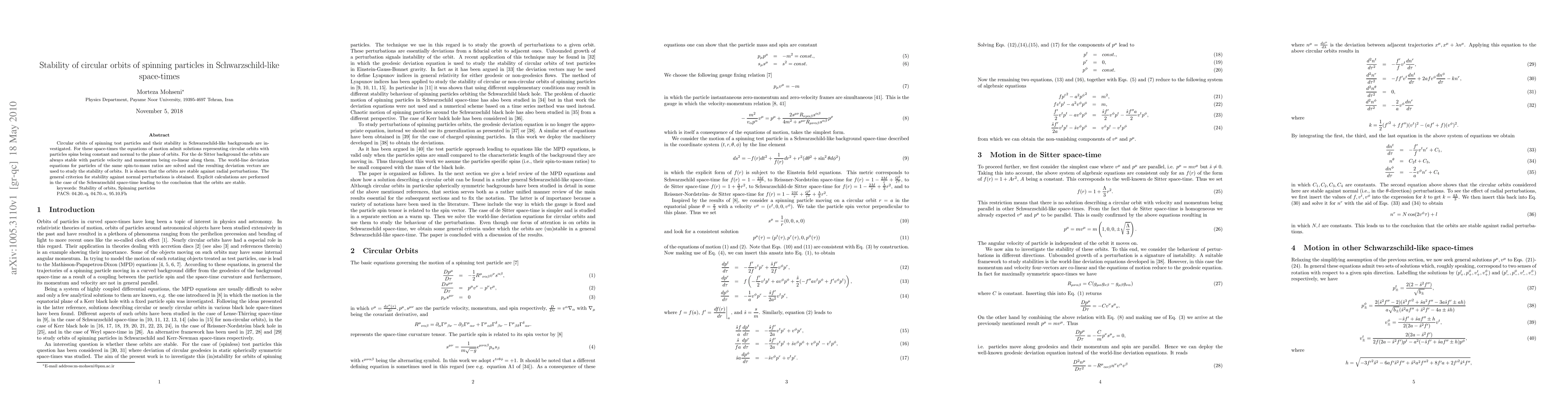 This paper investigates the stability of circular orbits for spinning particles in Schwarzschild-like space-times, showing that orbits in de Sitter backgrounds are stable and orbits in Schwarzschild space-time are stable against radial perturbations, with a general criterion for stability against normal perturbations derived.