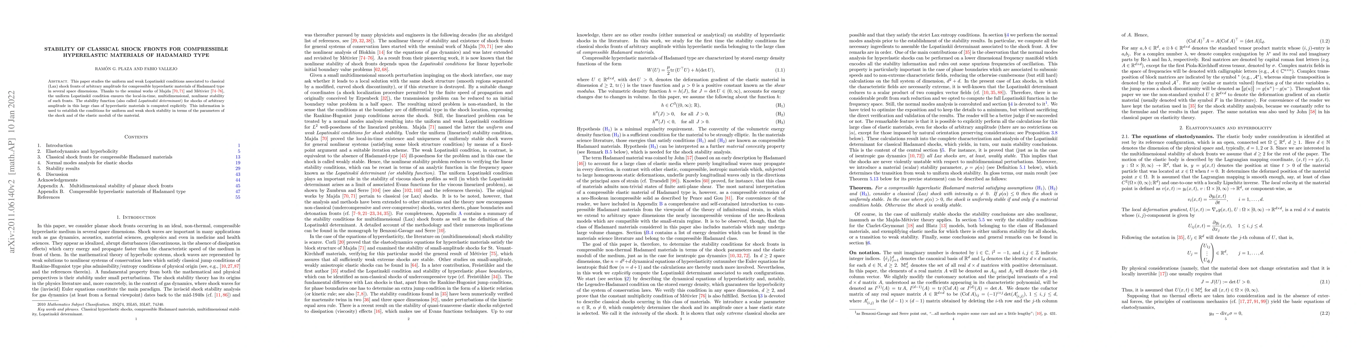 This paper studies the stability of shock fronts in compressible hyperelastic materials, establishing conditions for uniform and weak shock stability using a stability function computed explicitly.