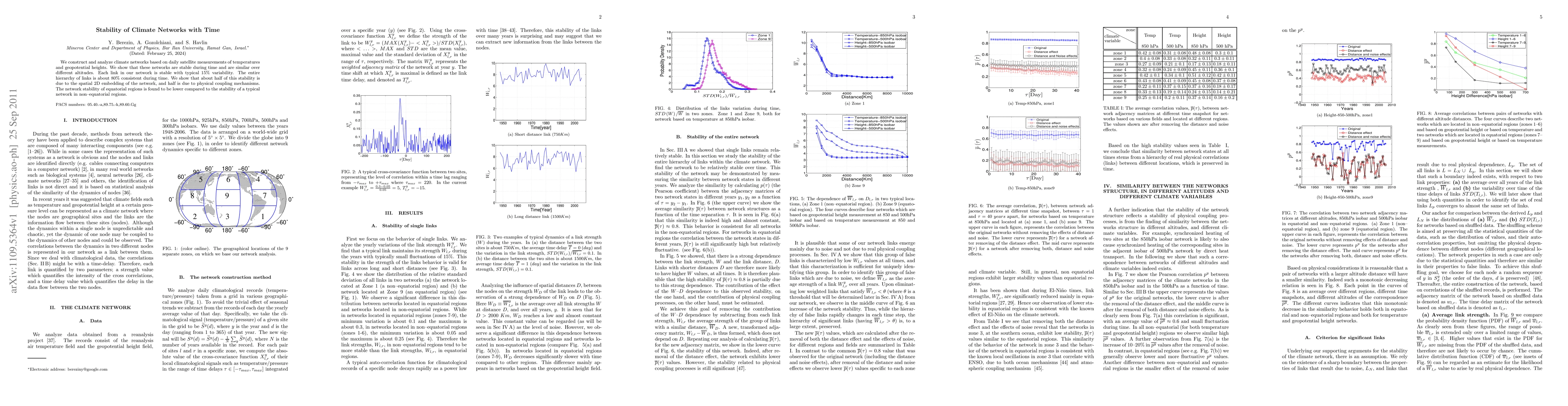 We construct and analyze climate networks based on daily satellite measurements of temperatures and geopotential heights. We show that these networks are stable during time and are similar over different altitudes. Each link in our network is stable with typical 15% variability. The entire hierarchy of links is about 80% consistent during time. We show that about half of this stability is due to the spatial 2D embedding of the network, and half is due to physical coupling mechanisms. The network stability of equatorial regions is found to be lower compared to the stability of a typical network in non-equatorial regions.