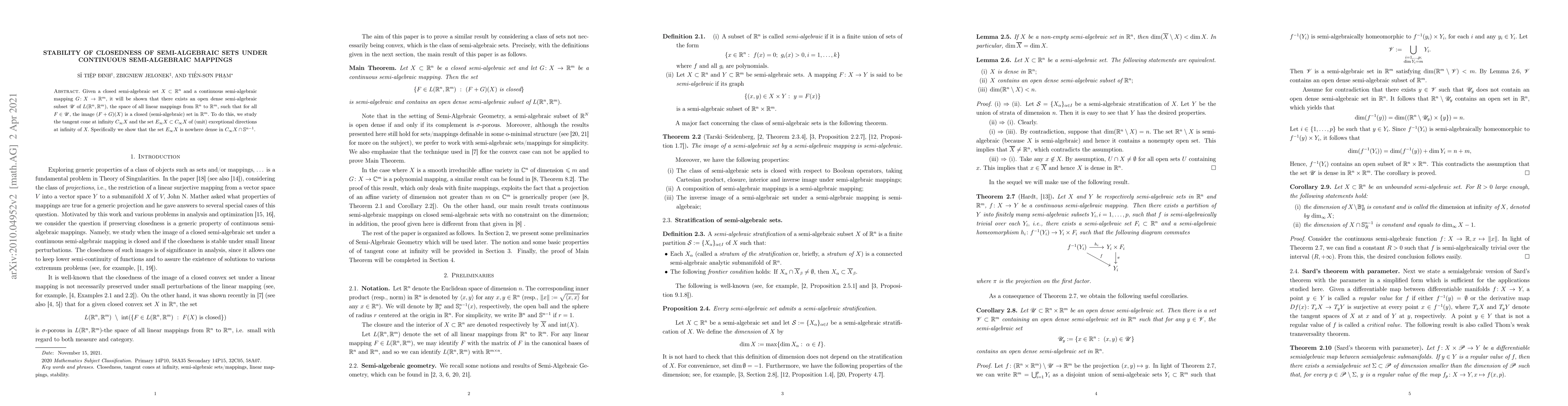 This paper proves that for a closed semi-algebraic set $X$ and a continuous semi-algebraic mapping $G$, there exists an open dense set of linear mappings $F$ such that the image $(F+G)(X)$ remains a closed semi-algebraic set. It uses the tangent cone and exceptional directions at infinity to demonstrate that the set of exceptional directions is nowhere dense.