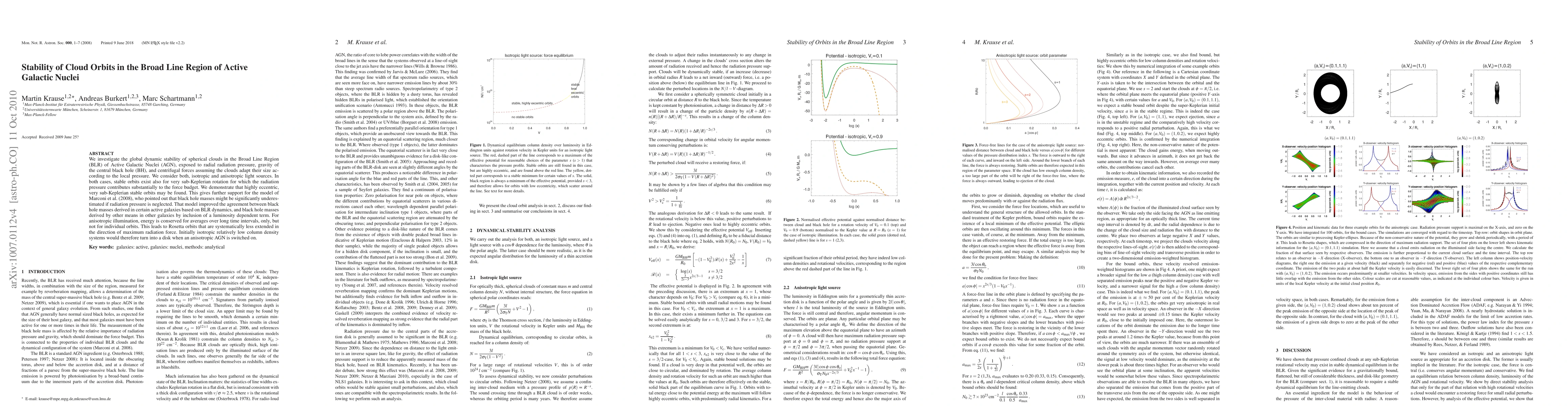 We investigate the global dynamic stability of spherical clouds in the Broad Line Region (BLR) of Active Galactic Nuclei (AGN), exposed to radial radiation pressure, gravity of the central black hole (BH), and centrifugal forces assuming the clouds adapt their size according to the local pressure. We consider both, isotropic and anisotropic light sources. In both cases, stable orbits exist also for very sub-Keplerian rotation for which the radiation pressure contributes substantially to the force budget. We demonstrate that highly eccentric, very sub-Keplerian stable orbits may be found. This gives further support for the model of Marconi et al. 2008, who pointed out that black hole masses might be significantly underestimated if radiation pressure is neglected. That model improved the agreement between black hole masses derived in certain active galaxies based on BLR dynamics, and black hole masses derived by other means in other galaxies by inclusion of a luminosity dependent term. For anisotropic illumination, energy is conserved for averages over long time intervals, only, but not for individual orbits. This leads to Rosetta orbits that are systematically less extended in the direction of maximum radiation force. Initially isotropic relatively low column density systems would therefore turn into a disk when an anisotropic AGN is switched on.