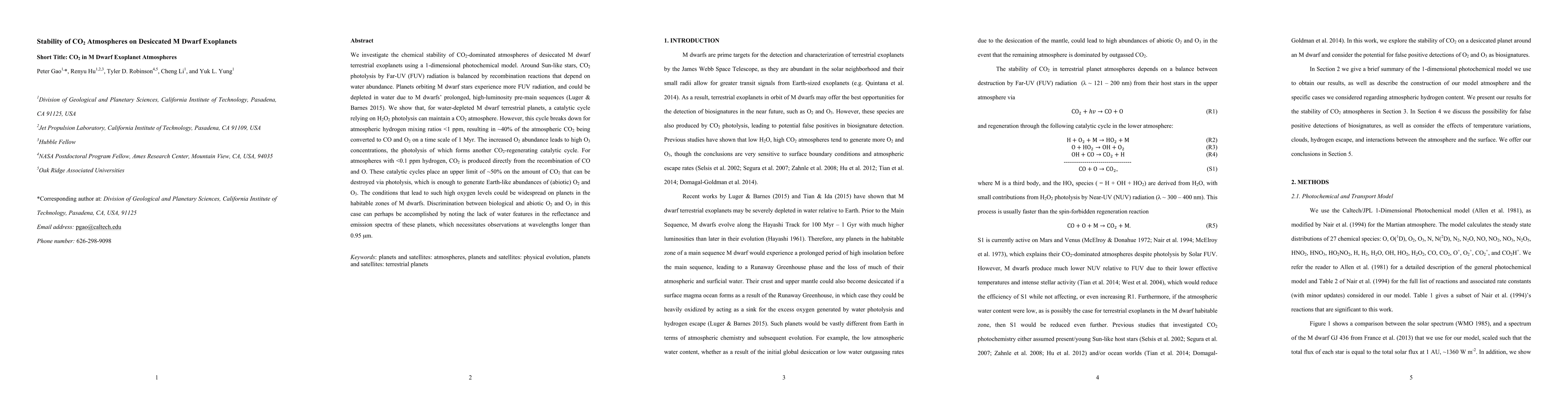 This paper explores the stability of CO2-dominated atmospheres on desiccated M dwarf exoplanets, revealing that catalytic cycles involving H2O2 photolysis can maintain CO2 levels despite high FUV radiation. However, low hydrogen mixing ratios (<1 ppm) lead to CO2 conversion to CO and O2, forming high O3 concentrations that regenerate CO2, limiting CO2 destruction to ~50%.