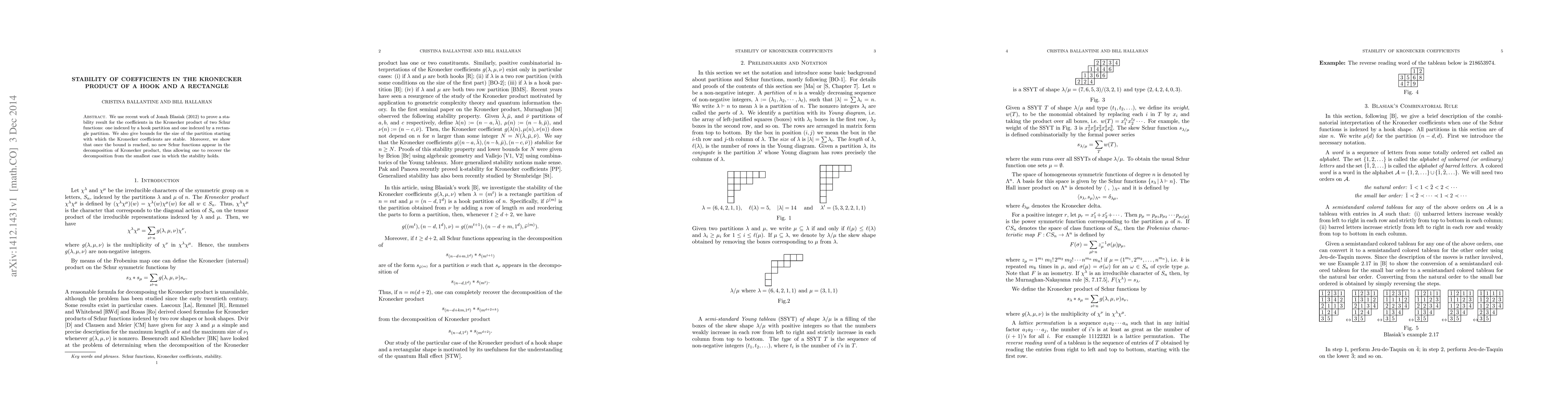 This paper proves a stability result for Kronecker product coefficients between a hook and a rectangle partition using Blasiak's (2012) work, establishing bounds for the size of partitions where the coefficients stabilize, and demonstrating that once the bound is reached, no new Schur functions emerge in the decomposition.