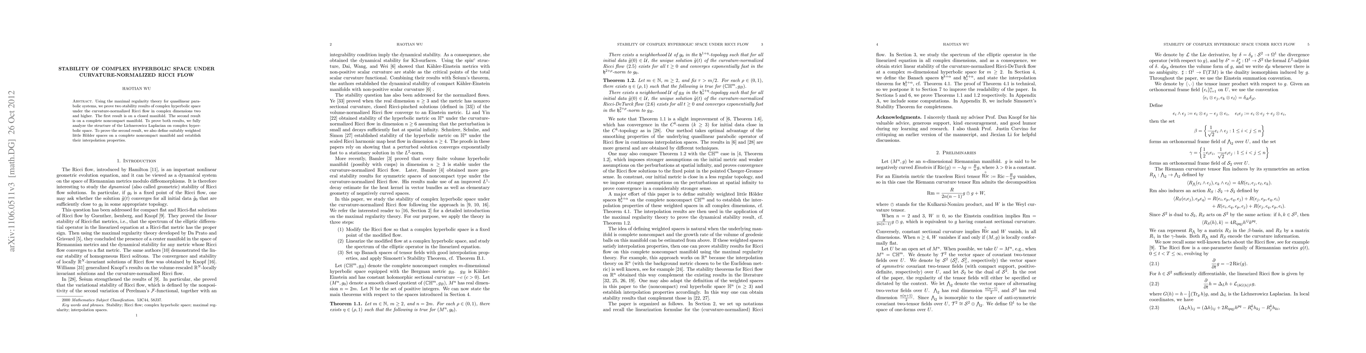 This paper proves stability results for complex hyperbolic space under curvature-normalized Ricci flow using maximal regularity theory and quasilinear parabolic systems. It establishes stability for both closed and complete noncompact manifolds, with special attention to the Lichnerowicz Laplacian and interpolation properties of weighted little Hölder spaces.