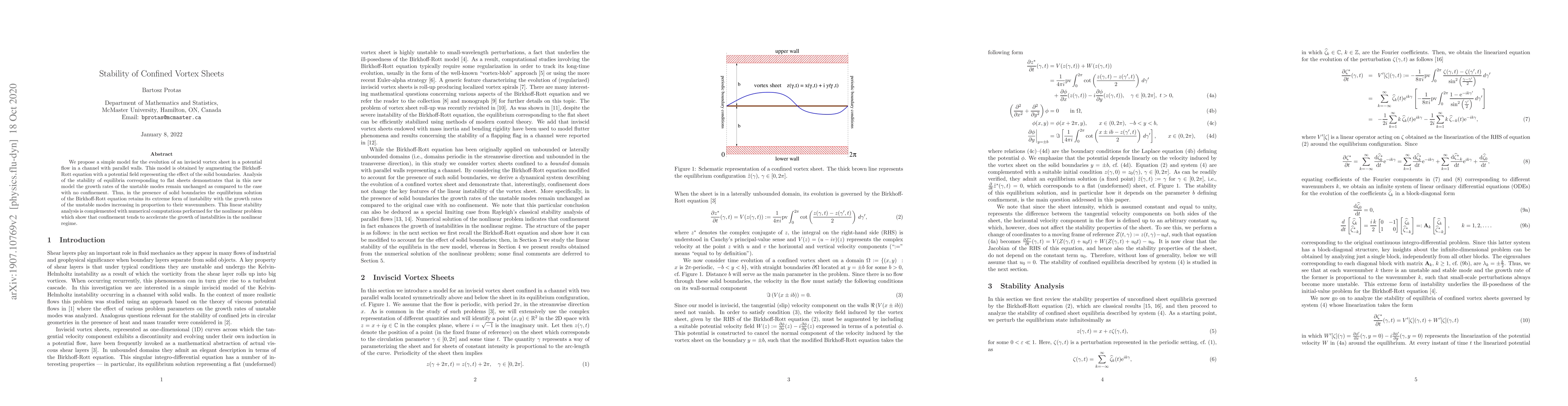 A new model for confined vortex sheets in a channel with parallel walls shows that solid boundaries accelerate instability growth in both linear and nonlinear regimes, while the growth rates of unstable modes remain unchanged compared to an unconfined case.