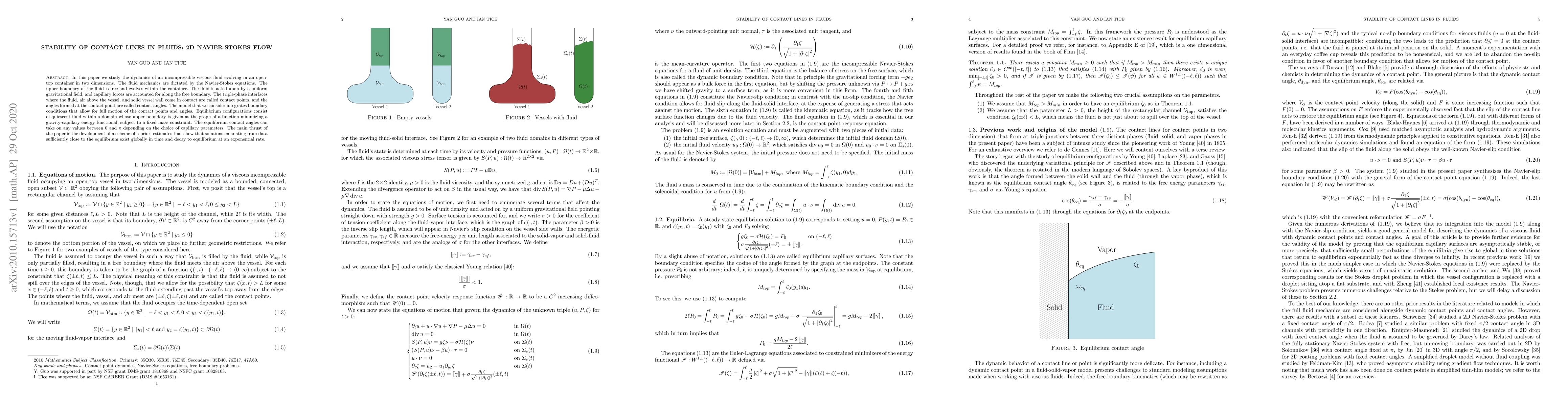 In this paper we study the dynamics of an incompressible viscous fluid evolving in an open-top container in two dimensions. The fluid mechanics are dictated by the Navier-Stokes equations. The upper boundary of the fluid is free and evolves within the container. The fluid is acted upon by a uniform gravitational field, and capillary forces are accounted for along the free boundary. The triple-phase interfaces where the fluid, air above the vessel, and solid vessel wall come in contact are called contact points, and the angles formed at the contact point are called contact angles. The model that we consider integrates boundary conditions that allow for full motion of the contact points and angles. Equilibrium configurations consist of quiescent fluid within a domain whose upper boundary is given as the graph of a function minimizing a gravity-capillary energy functional, subject to a fixed mass constraint. The equilibrium contact angles can take on any values between $0$ and $\pi$ depending on the choice of capillary parameters. The main thrust of the paper is the development of a scheme of a priori estimates that show that solutions emanating from data sufficiently close to the equilibrium exist globally in time and decay to equilibrium at an exponential rate.