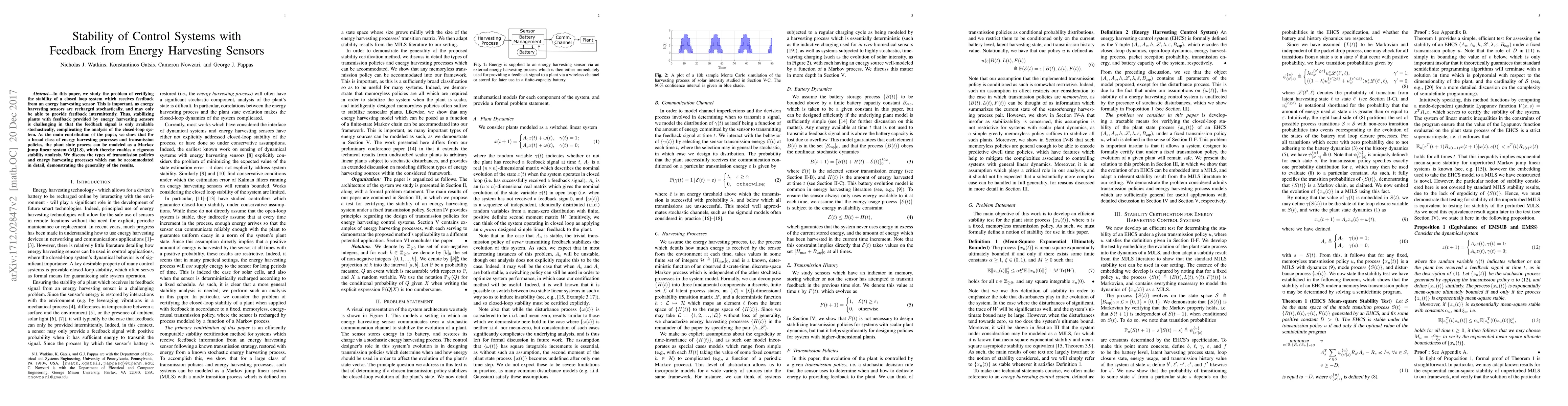 This paper certifies the stability of closed-loop systems with feedback from intermittently available energy harvesting sensors, modeling them as Markov jump linear systems (MJLS) for rigorous analysis. The study details various transmission policies and energy harvesting processes that fit this model, showcasing the method's broad applicability.