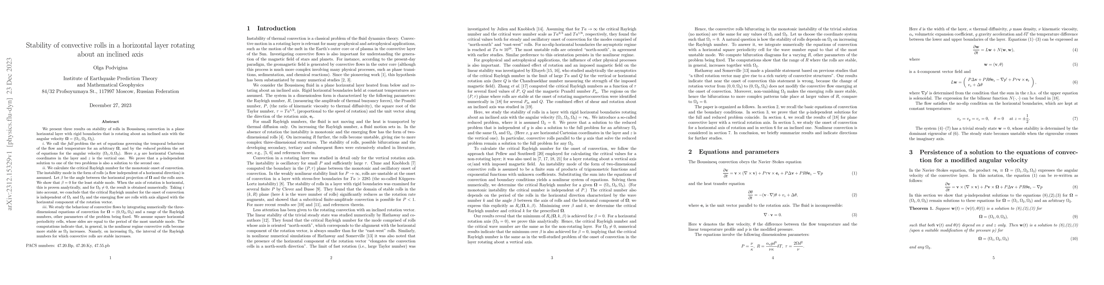 We present three results on stability of rolls in Boussinesq convection in a plane horizontal layer with rigid boundaries that is rotating about an inclined axis with the angular velocity $\Omega=(\Omega_1,\Omega_2,\Omega_3)$. i. We call the full problem the set of equations governing the temporal behaviour of the flow and temperature for an arbitrary $\Omega$, and by the reduced problem the set of equations for the angular velocity $(\Omega_1,0,\Omega_3)$. Here $x,y$ are horizontal Cartesian coordinates in the layer and $z$ is the vertical one. We prove that a $y$-independent solution to one of the two problems is also a solution to the second one. ii. We calculate the critical Rayleigh number for the monotonic onset of convection. The instability mode in the form of rolls (a flow independent of a horizontal direction) is assumed. Let $\beta$ be the angle between the horizontal projection of $\Omega$ and the rolls axes. We show that $\beta=0$ for the least stable mode. Taking i into account, we conclude that the critical Rayleigh number for the onset of convection is independent of $\Omega_1$ and $\Omega_2$ and the emerging flow are rolls with axis aligned with the horizontal component of the rotation vector. iii. We study the behaviour of convective flows by integrating numerically the three-dimensional equations of convection for $\Omega=(0,\Omega_2,\Omega_3)$ and a range of the Rayleigh numbers, other parameters of the problem being fixed. We assume square horizontal periodicity cells, whose sides are equal to the period of the most unstable mode. The computations indicate that, in general, in the nonlinear regime convective rolls become more stable as $\Omega_2$ increases. Namely, on increasing $\Omega_2$, the interval of the Rayleigh numbers for which convective rolls are stable increases.