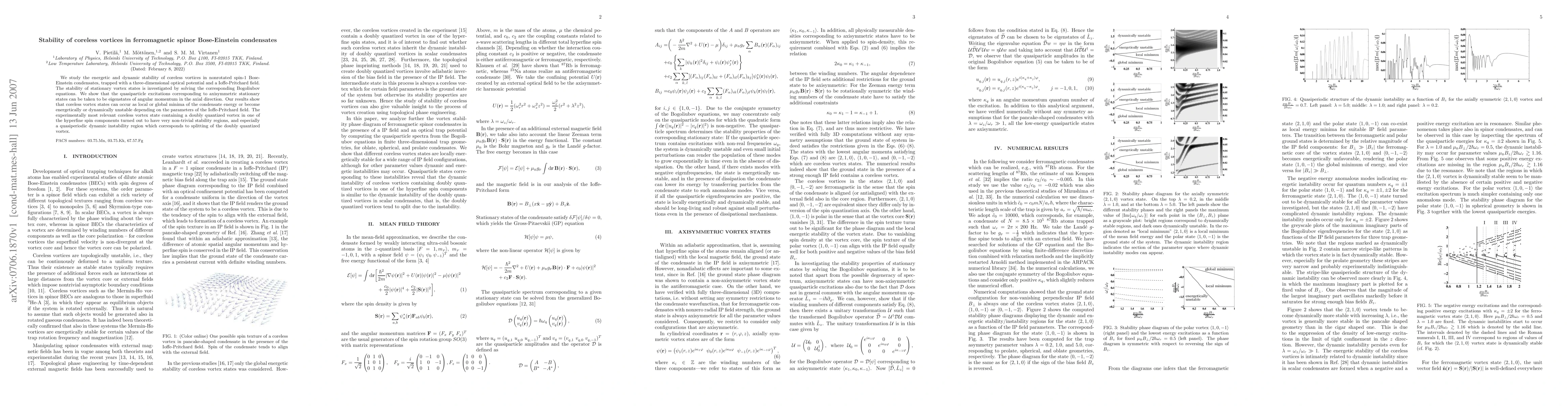 This paper investigates the energetic and dynamic stability of coreless vortices in spin-1 ferromagnetic spinor Bose-Einstein condensates, revealing that such vortices can be stable or unstable depending on the Ioffe-Pritchard field parameters, with a notable quasiperiodic dynamic instability region for a doubly quantized vortex state.