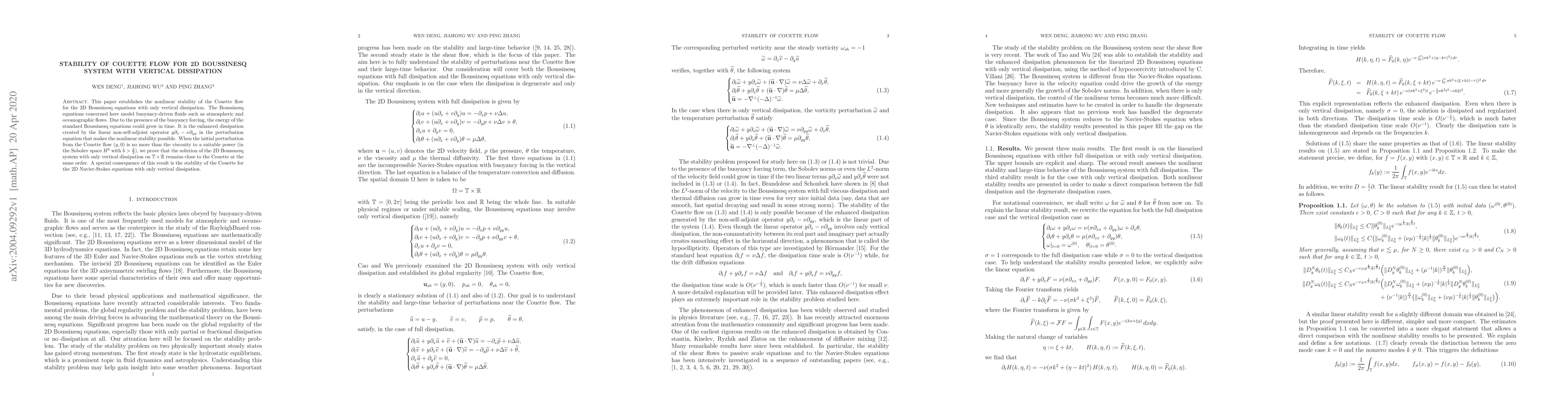 This paper proves the nonlinear stability of Couette flow for the 2D Boussinesq system with vertical dissipation, demonstrating that small perturbations remain close to the Couette flow due to enhanced dissipation. The stability extends to the 2D Navier-Stokes equations with only vertical dissipation.