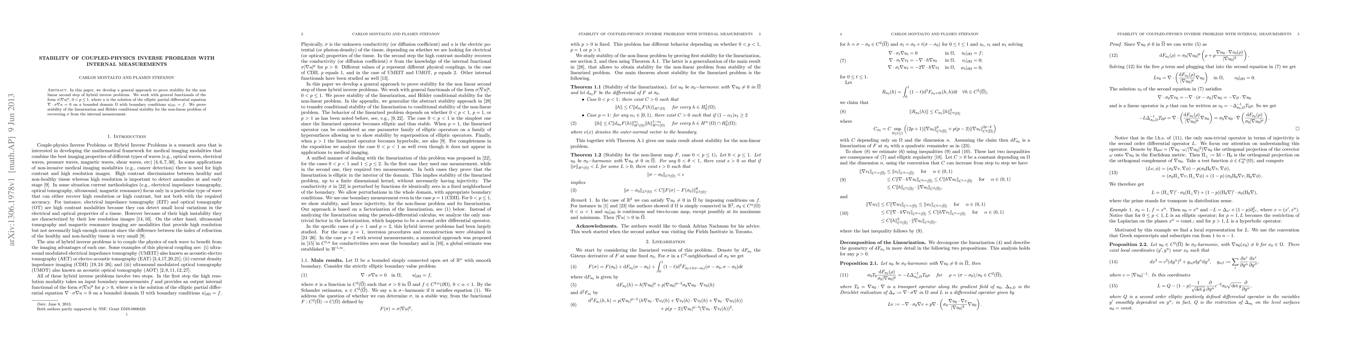 In this paper, we develop a general approach to prove stability for the non linear second step of hybrid inverse problems. We work with general functionals of the form $\sigma|\nabla u|^p$, $0 < p \leq 1$, where $u$ is the solution of the elliptic partial differential equation $\nabla\cdot \sigma \nabla u =0$ on a bounded domain $\Omega$ with boundary conditions $u|_{\partial \Omega} = f$. We prove stability of the linearization and H\"older conditional stability for the non-linear problem of recovering $\sigma$ from the internal measurement.