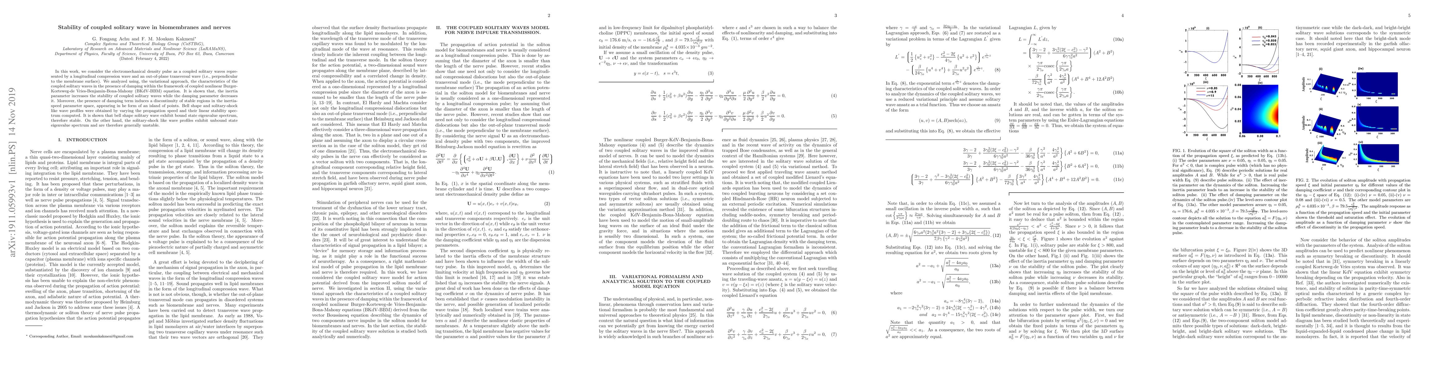 In this work, we consider the electromechanical density pulse as a coupled solitary waves represented by a longitudinal compression wave and an out-of-plane transversal wave (i.e., perpendicular to the membrane surface). We analyzed using, the variational approach, the characteristics of the coupled solitary waves in the presence of damping within the framework of coupled nonlinear Burger-Korteweg-de Vries-Benjamin-Bona-Mahony (BKdV-BBM) equation. It is shown that, the inertia parameter increases the stability of coupled solitary waves while the damping parameter decreases it. Moreover, the presence of damping term induces a discontinuity of stable regions in the inertia-speed parameter space, appearing in he form of an island of points. Bell shape and solitary-shock like wave profiles were obtained by varying the propagation speed and their linear stability spectrum computed. It is shown that bell shape solitary wave exhibit bound state eigenvalue spectrum, therefore stable. On the other hand, the solitary-shock like wave profiles exhibit unbound state eigenvalue spectrum and are therefore generally unstable.