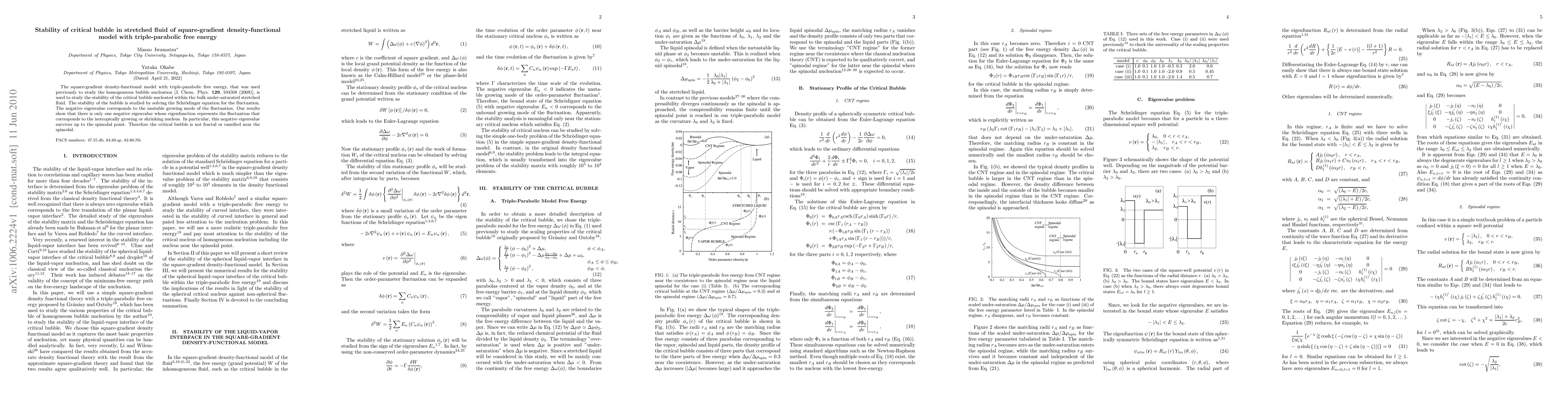 The square-gradient density-functional model with triple-parabolic free energy, that was used previously to study the homogeneous bubble nucleation [J. Chem. Phys. 129, 104508 (2008)], is used to study the stability of the critical bubble nucleated within the bulk under-saturated stretched fluid. The stability of the bubble is studied by solving the Schr\"odinger equation for the fluctuation. The negative eigenvalue corresponds to the unstable growing mode of the fluctuation. Our results show that there is only one negative eigenvalue whose eigenfunction represents the fluctuation that corresponds to the isotropically growing or shrinking nucleus. In particular, this negative eigenvalue survives up to the spinodal point. Therefore the critical bubble is not fractal or ramified near the spinodal.