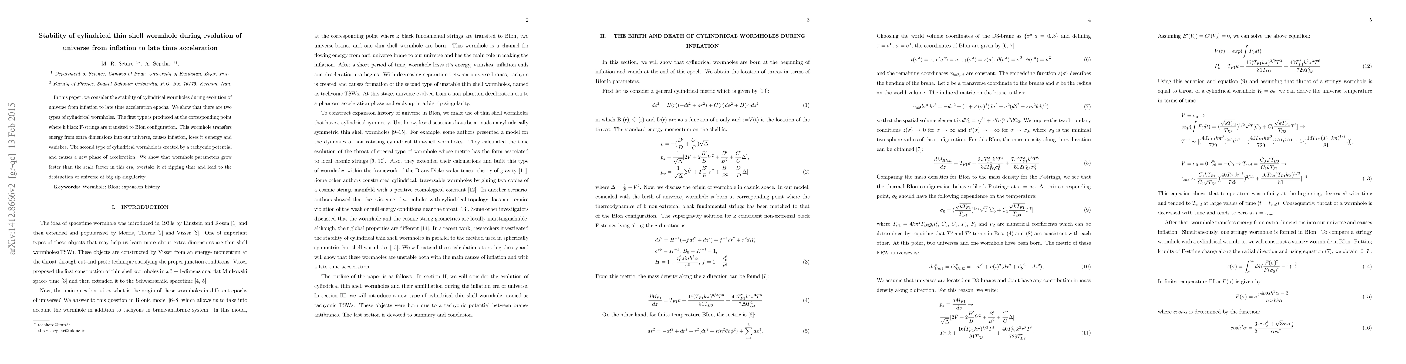 In this paper, we consider the stability of cylindrical wormholes during evolution of universe from inflation to late time acceleration epochs. We show that there are two types of cylindrical wormholes. The first type is produced at the corresponding point where k black F-strings are transited to BIon configuration. This wormhole transfers energy from extra dimensions into our universe, causes inflation, loses it's energy and vanishes. The second type of cylindrical wormhole is created by a tachyonic potential and causes a new phase of acceleration. We show that wormhole parameters grow faster than the scale factor in this era, overtake it at ripping time and lead to the destruction of universe at big rip singularity.