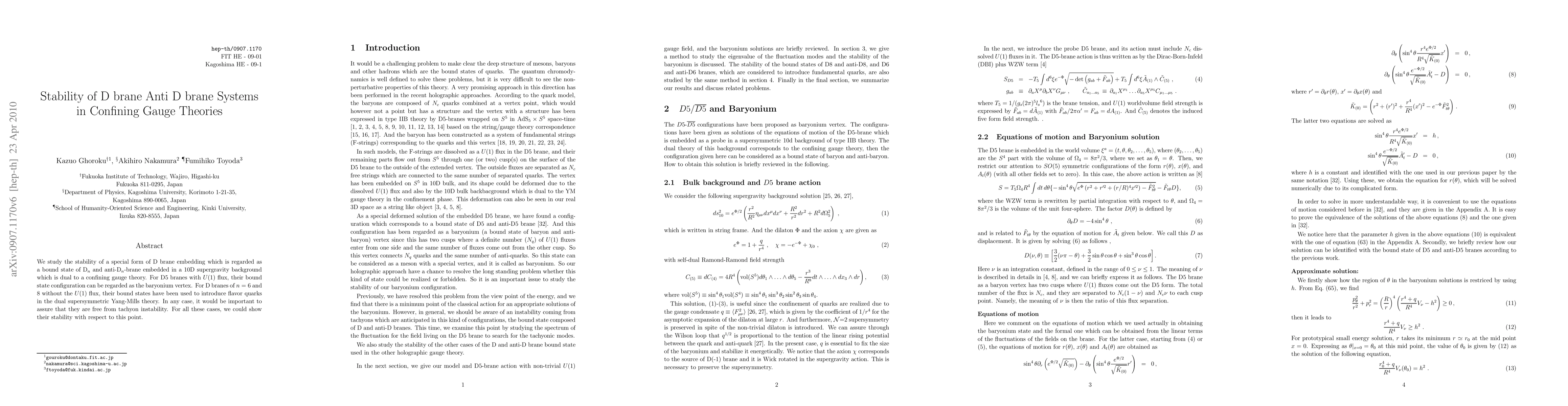 This paper investigates the stability of D brane-anti D brane systems embedded in a 10D supergravity background, dual to confining gauge theories. It demonstrates that various configurations, including D5 branes with $U(1)$ flux and D branes of $n=6$ and 8 without flux, are free from tachyon instability, ensuring their stability.