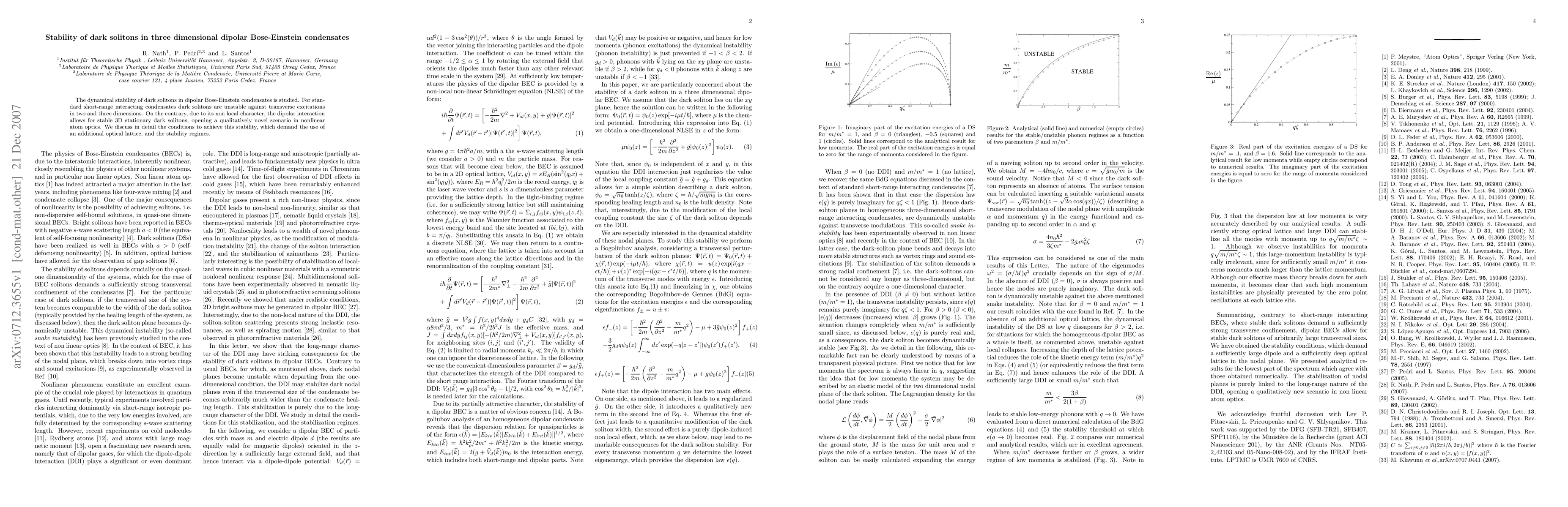 This study investigates the dynamical stability of dark solitons in three-dimensional dipolar Bose-Einstein condensates, revealing that unlike short-range interactions, dipolar interactions enable stable 3D stationary dark solitons. Achieving this stability requires an additional optical lattice, marking a new scenario in nonlinear atom optics.