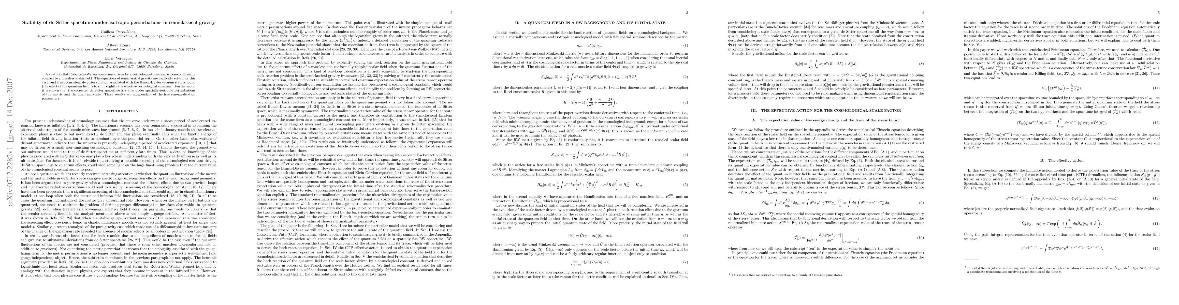 This paper investigates the stability of de Sitter spacetime under isotropic perturbations in semiclassical gravity, where a massless scalar field is non-conformally coupled to the cosmological constant. It finds a self-consistent de Sitter solution with the Bunch-Davies vacuum state and demonstrates the stability of the corrected spacetime against metric and quantum perturbations, independent of renormalization parameters.