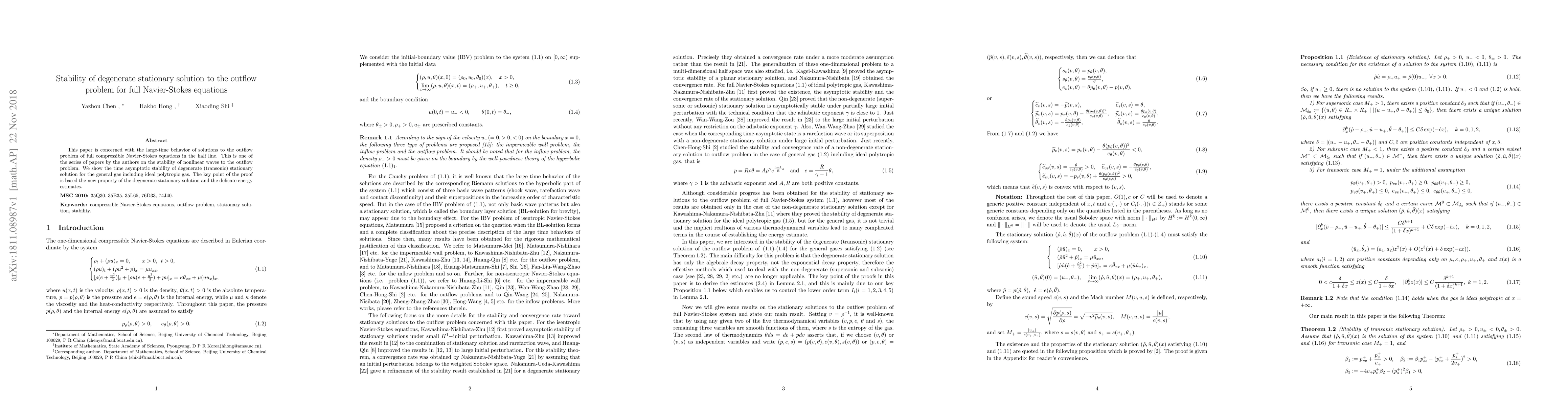 This paper investigates the large-time behavior of solutions to the outflow problem for compressible Navier-Stokes equations, demonstrating the time asymptotic stability of degenerate stationary solutions, including transonic states, using novel properties and refined energy estimates.