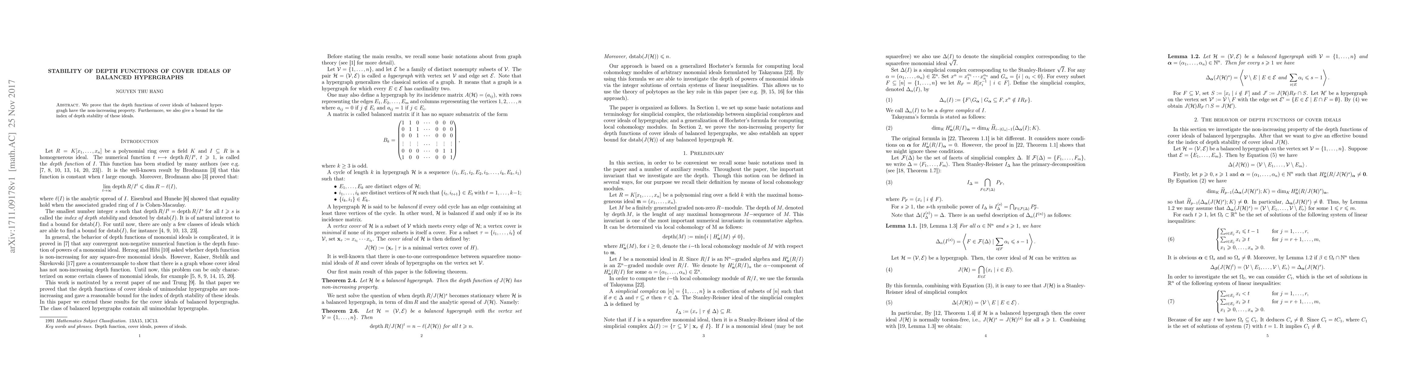 We prove that the depth functions of cover ideals of balanced hyper- gragh have the non-increasing property. Furthermore, we also give a bound for the index of depth stability of these ideals.