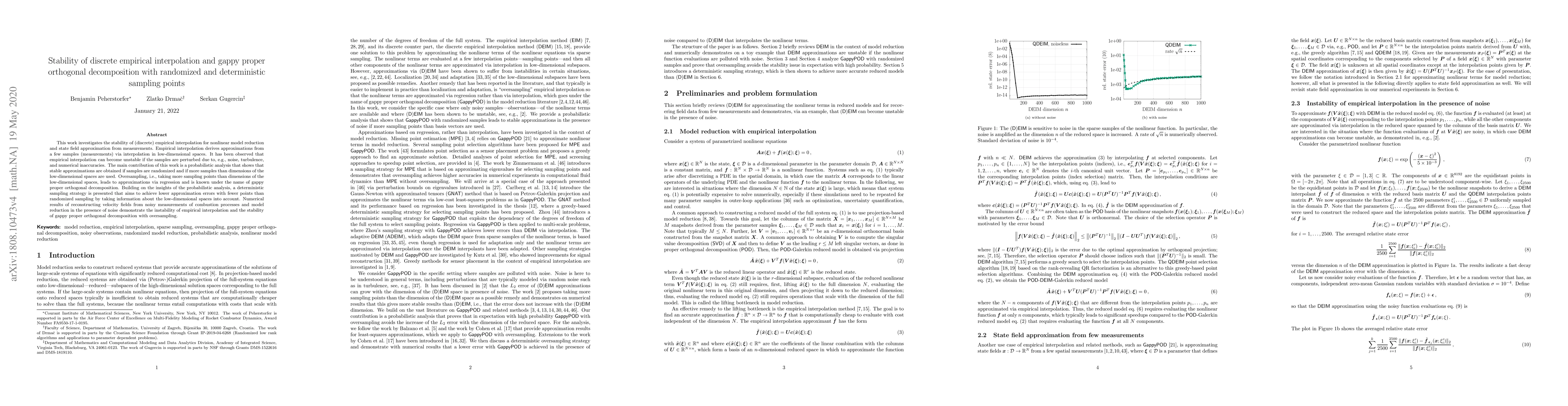 This work investigates the stability of (discrete) empirical interpolation for nonlinear model reduction and state field approximation from measurements. Empirical interpolation derives approximations from a few samples (measurements) via interpolation in low-dimensional spaces. It has been observed that empirical interpolation can become unstable if the samples are perturbed due to, e.g., noise, turbulence, and numerical inaccuracies. The main contribution of this work is a probabilistic analysis that shows that stable approximations are obtained if samples are randomized and if more samples than dimensions of the low-dimensional spaces are used. Oversampling, i.e., taking more sampling points than dimensions of the low-dimensional spaces, leads to approximations via regression and is known under the name of gappy proper orthogonal decomposition. Building on the insights of the probabilistic analysis, a deterministic sampling strategy is presented that aims to achieve lower approximation errors with fewer points than randomized sampling by taking information about the low-dimensional spaces into account. Numerical results of reconstructing velocity fields from noisy measurements of combustion processes and model reduction in the presence of noise demonstrate the instability of empirical interpolation and the stability of gappy proper orthogonal decomposition with oversampling.