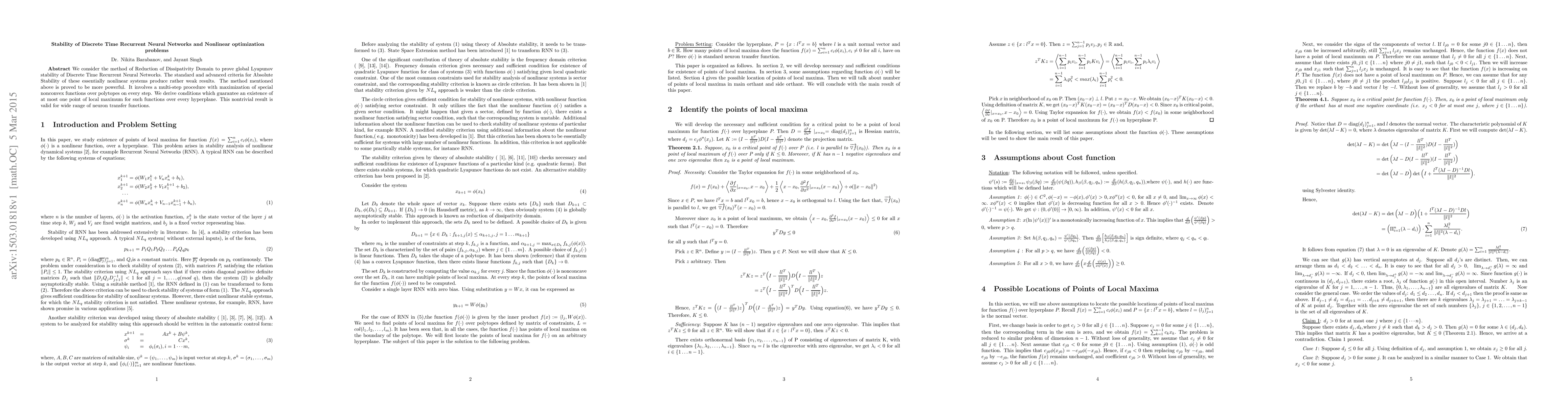 We consider the method of Reduction of Dissipativity Domain to prove global Lyapunov stability of Discrete Time Recurrent Neural Networks. The standard and advanced criteria for Absolute Stability of these essentially nonlinear systems produce rather weak results. The method mentioned above is proved to be more powerful. It involves a multi-step procedure with maximization of special nonconvex functions over polytopes on every step. We derive conditions which guarantee an existence of at most one point of local maximum for such functions over every hyperplane. This nontrivial result is valid for wide range of neuron transfer functions.