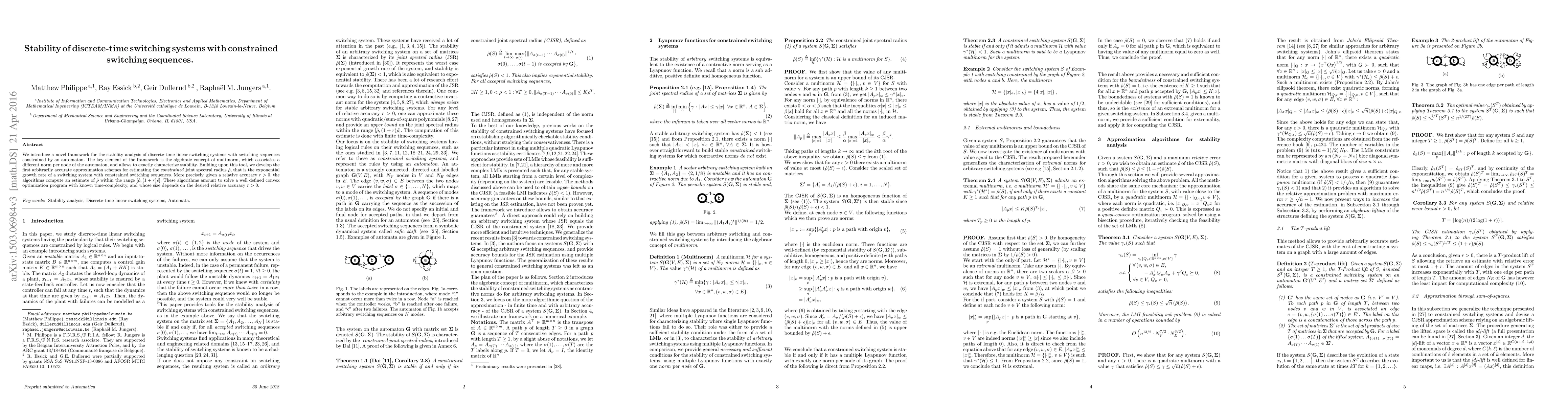 The research introduces a novel framework for stability analysis of discrete-time linear switching systems with constrained switching sequences, utilizing the algebraic concept of multinorms to exactly characterize stability and develop approximation schemes for estimating the constrained joint spectral radius (CJSR).