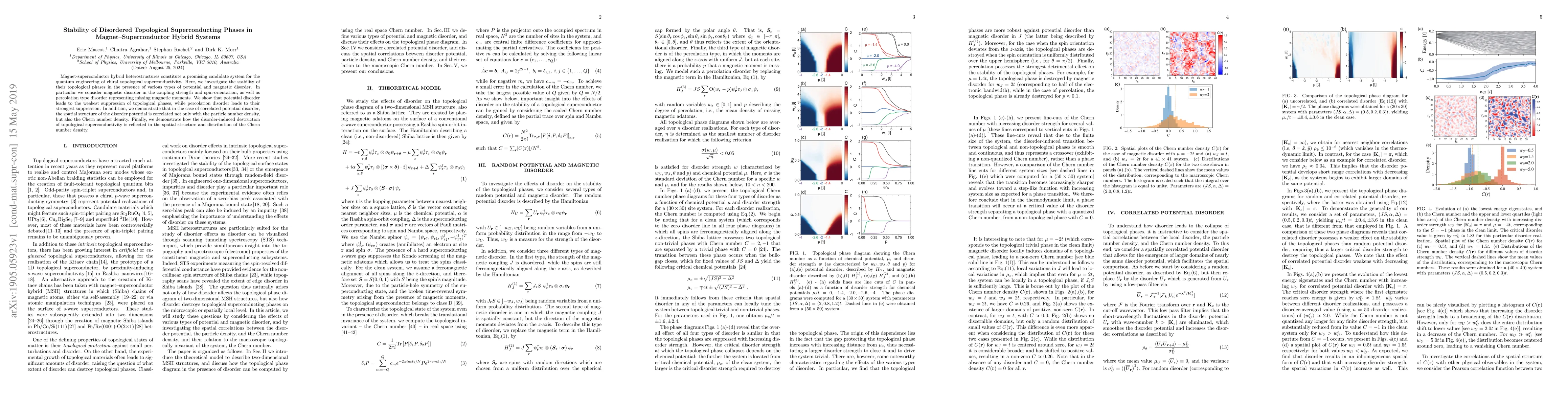 This paper investigates the stability of topological superconducting phases in magnet-superconductor hybrid systems under various types of disorder, finding that potential disorder has the least impact while percolation disorder most strongly suppresses these phases. It also reveals that correlated potential disorder correlates with both particle and Chern number density, and shows how topological superconductivity's destruction is reflected in the spatial distribution of Chern number density.