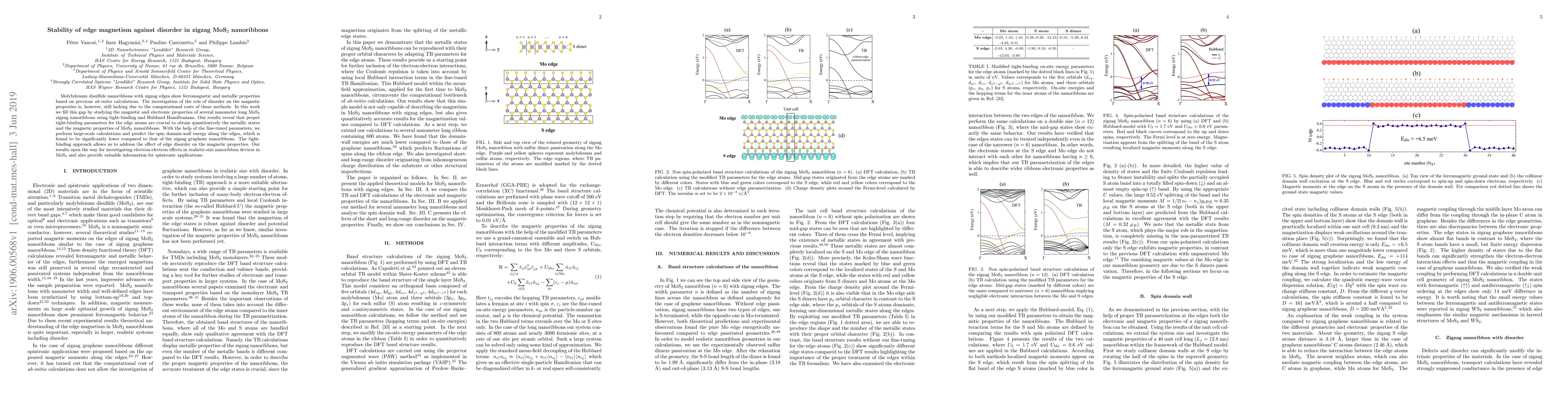 Molybdenum disulfide nanoribbons with zigzag edges show ferromagnetic and metallic properties based on previous \emph{ab-initio} calculations. The investigation of the role of disorder on the magnetic properties is, however, still lacking due to the computational costs of these methods. In this work we fill this gap by studying the magnetic and electronic properties of several nanometer long MoS$_2$ zigzag nanoribbons using tight-binding and Hubbard Hamiltonians. Our results reveal that proper tight-binding parameters for the edge atoms are crucial to obtain quantitatively the metallic states and the magnetic properties of MoS$_2$ nanoribbons. With the help of the fine-tuned parameters, we perform large-scale calculations and predict the spin domain-wall energy along the edges, which is found to be significantly lower compared to that of the zigzag graphene nanoribbons. The tight-binding approach allows us to address the effect of edge disorder on the magnetic properties. Our results open the way for investigating electron-electron effects in realistic-size nanoribbon devices in MoS$_2$ and also provide valuable information for spintronic applications.