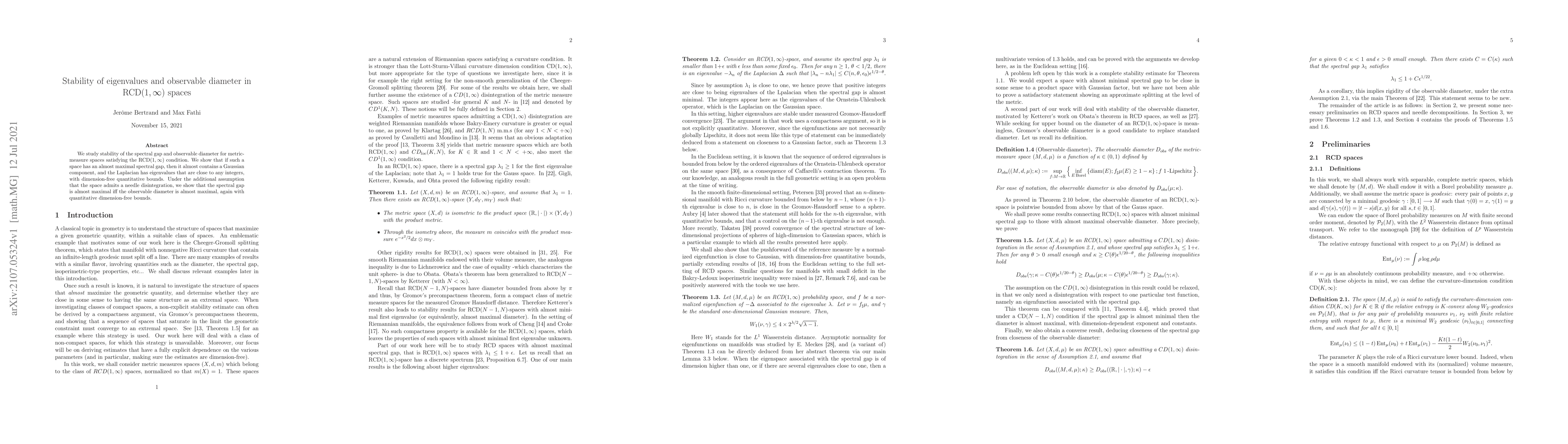 We study stability of the spectral gap and observable diameter for metricmeasure spaces satisfying the RCD(1, $\infty$) condition. We show that if such a space has an almost maximal spectral gap, then it almost contains a Gaussian component, and the Laplacian has eigenvalues that are close to any integers, with dimension-free quantitative bounds. Under the additional assumption that the space admits a needle disintegration, we show that the spectral gap is almost maximal iff the observable diameter is almost maximal, again with quantitative dimension-free bounds.