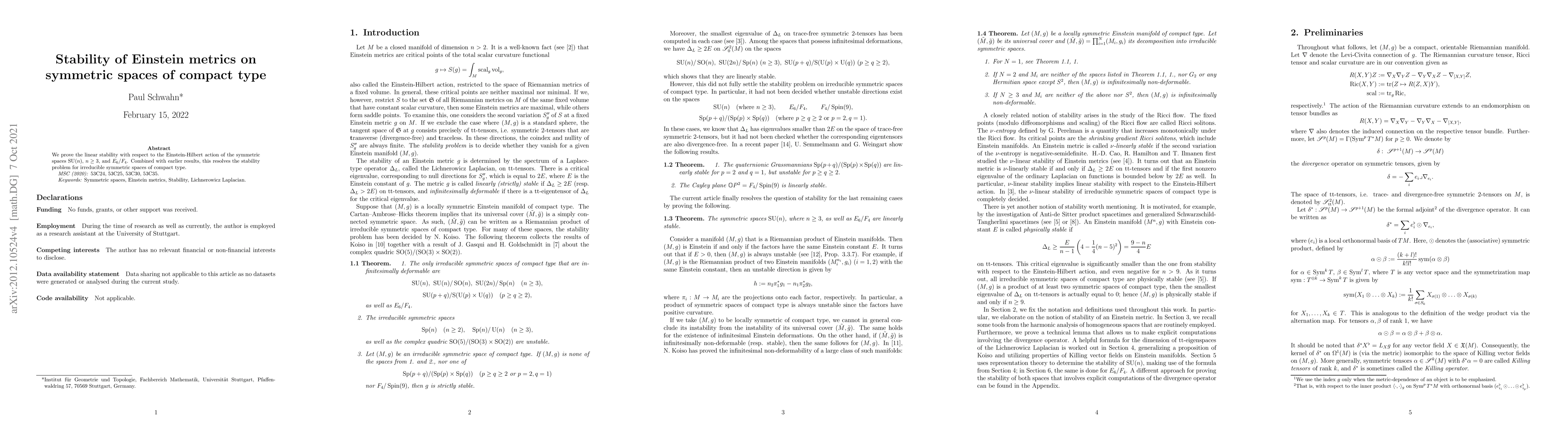 Researchers prove linear stability of Einstein metrics on SU(n) spaces for n >= 3 and E6/F4, resolving a long-standing issue in the field of symmetrical spaces.