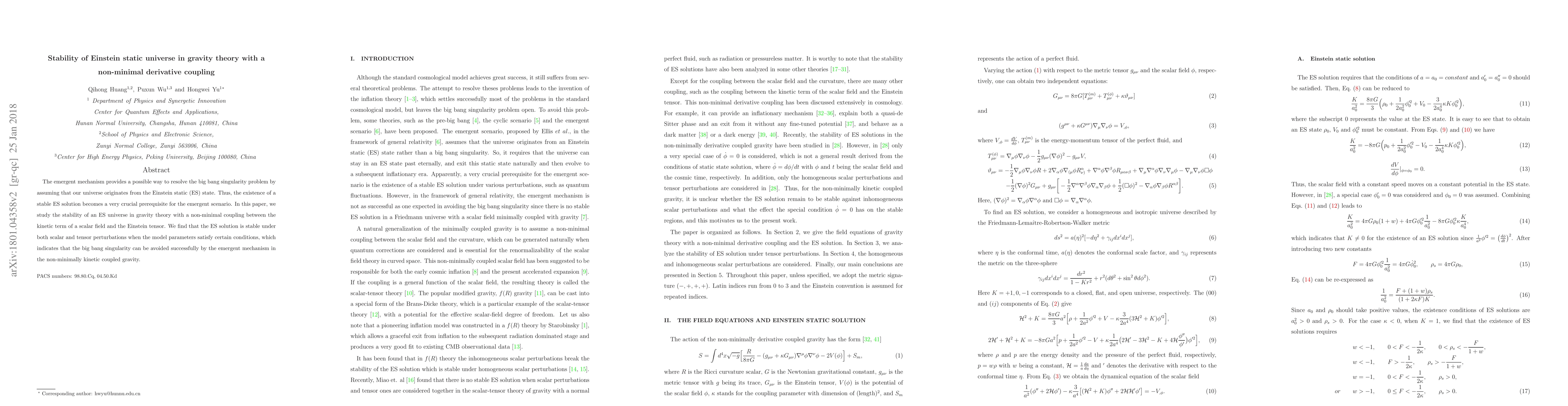 This paper investigates the stability of the Einstein static universe (ES) in a gravity theory featuring non-minimal derivative coupling between a scalar field and the Einstein tensor. It finds that the ES solution remains stable under scalar and tensor perturbations under specific parameter conditions, suggesting the potential for the emergent mechanism to avoid the big bang singularity.