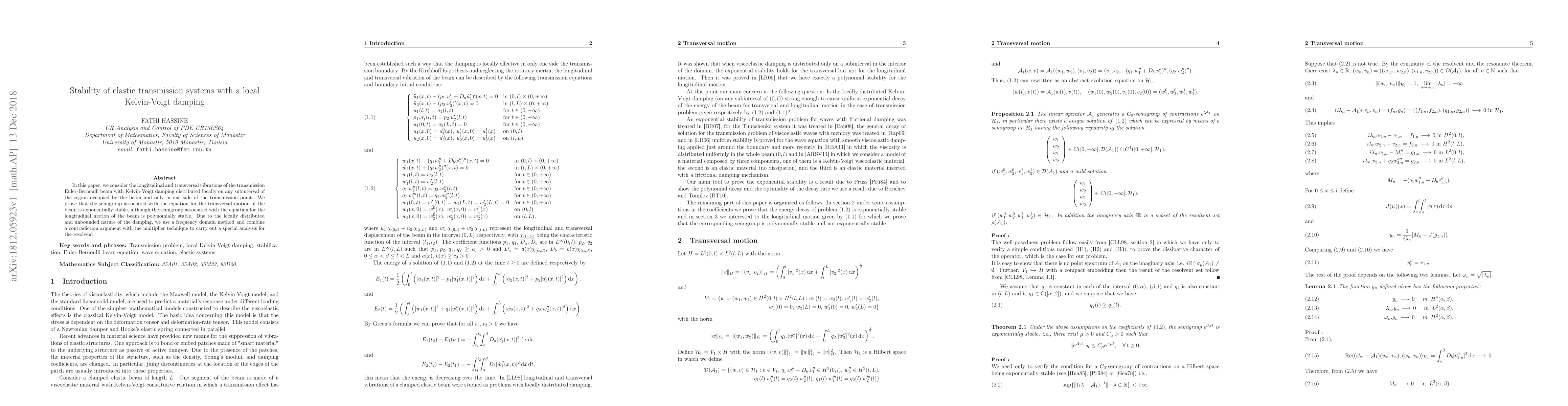 This paper investigates the stability of elastic transmission systems with localized Kelvin-Voigt damping, proving exponential stability for transversal vibrations and polynomial stability for longitudinal vibrations. A frequency domain method and contradiction argument are employed to analyze the resolvent due to the unique damping distribution.