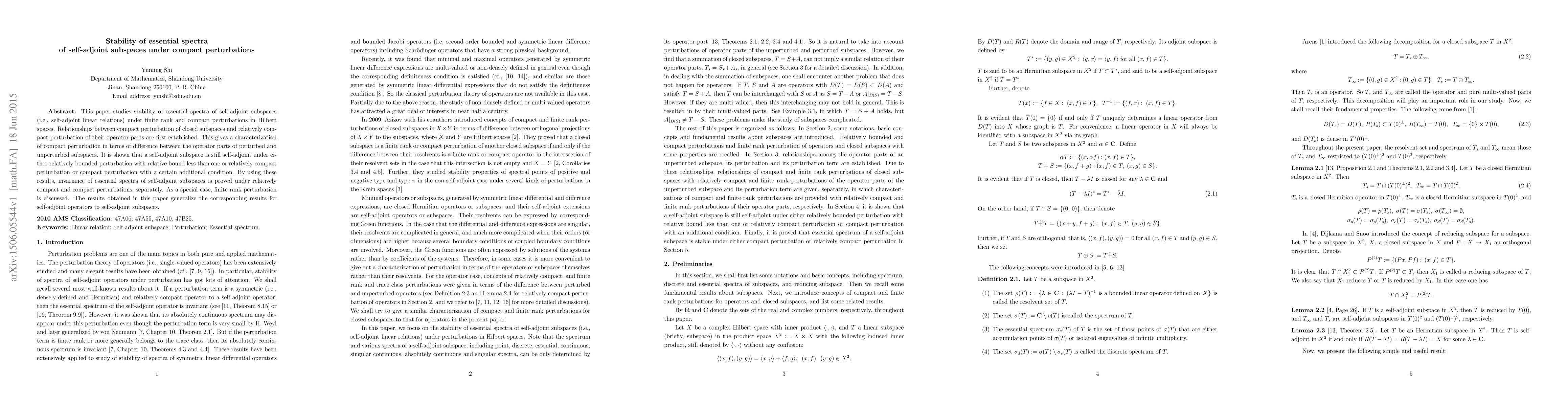 This paper investigates the stability of essential spectra in self-adjoint subspaces under compact perturbations, establishing conditions for self-adjointness preservation and proving invariance of essential spectra under relatively compact and compact perturbations. It generalizes previous results for self-adjoint operators to self-adjoint subspaces.