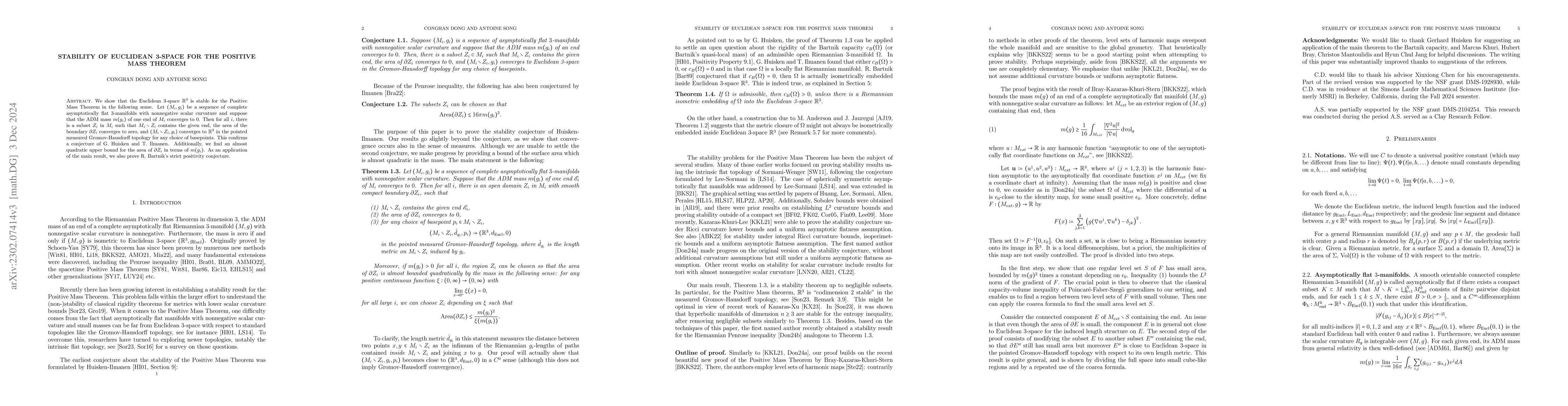 We show that the Euclidean 3-space $(\mathbb{R}^3, d_{\mathrm{Eucl}}) $ is stable for the Positive Mass Theorem in the following sense. Let $(M_i^3, g_i)$ be a sequence of asymptotically flat 3-manifolds with nonnegative scalar curvature and suppose that their ADM masses $m(g_i)$ converge to 0. Then for all $i$, there is a subset $Z_i$ in $M_i^3$ such that the area of the boundary $\partial Z_i$ converges to zero and for any base point $p_i\in M_i\setminus Z_i$, the sequence of pointed manifolds $(M_i^3\setminus Z_i, \hat{d}_{g_i}, p_i)$ converges to $(\mathbb{R}^3, d_{\mathrm{Eucl}}, 0)$ in the pointed measured Gromov-Hausdorff topology, where $\hat{d}_{g_i}$ is the induced length metric. This confirms a conjecture of G. Huisken and T. Ilmanen. We also find an almost quadratic bound for the area of $\partial Z_i$ in terms of $m(g_i)$.