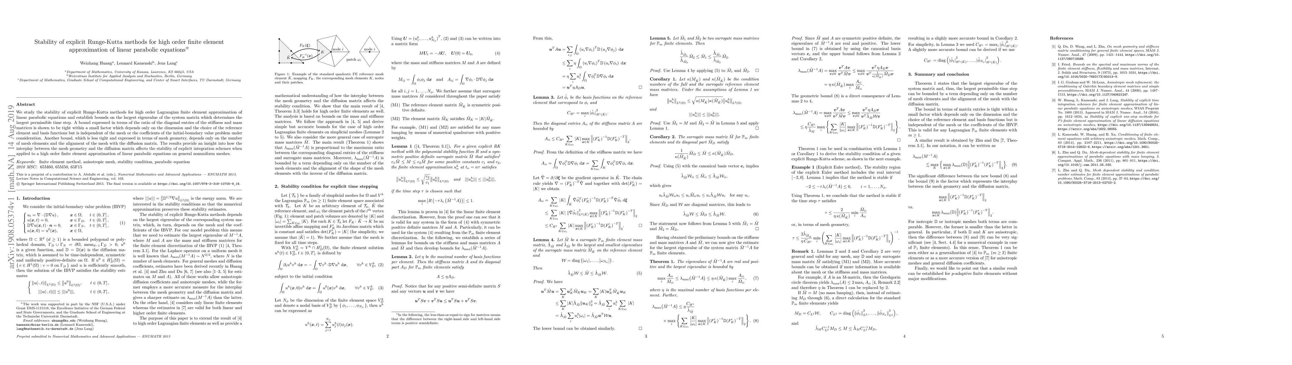 Researchers studied the stability of explicit Runge-Kutta methods for solving linear parabolic equations on high-order finite element approximations, establishing bounds based on stiffness and mass matrices or mesh geometry.
