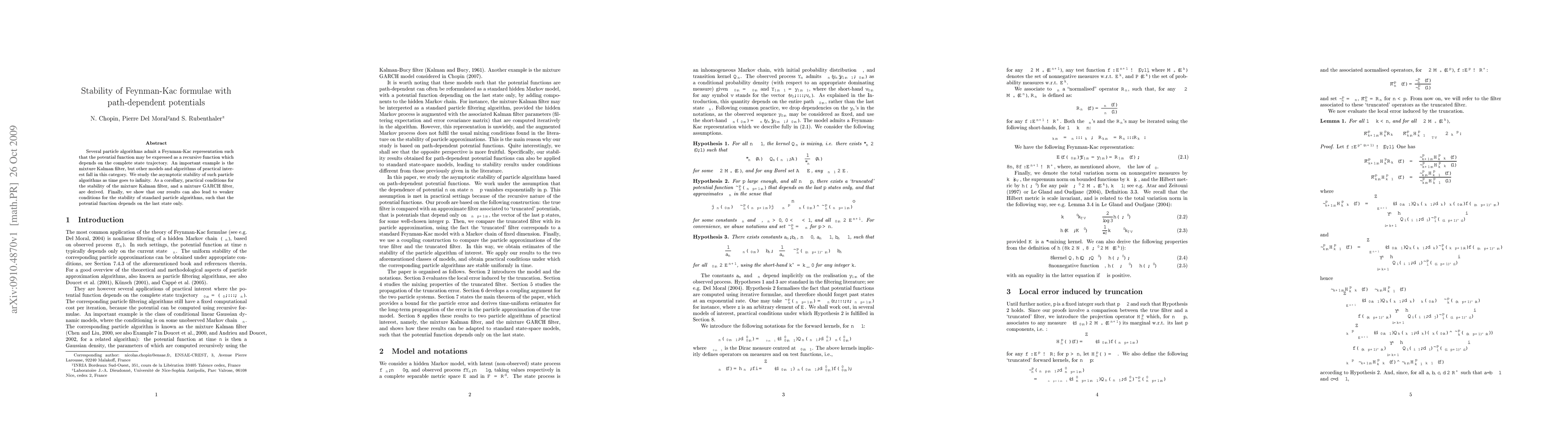 Several particle algorithms admit a Feynman-Kac representation such that the potential function may be expressed as a recursive function which depends on the complete state trajectory. An important example is the mixture Kalman filter, but other models and algorithms of practical interest fall in this category. We study the asymptotic stability of such particle algorithms as time goes to infinity. As a corollary, practical conditions for the stability of the mixture Kalman filter, and a mixture GARCH filter, are derived. Finally, we show that our results can also lead to weaker conditions for the stability of standard particle algorithms, such that the potential function depends on the last state only.