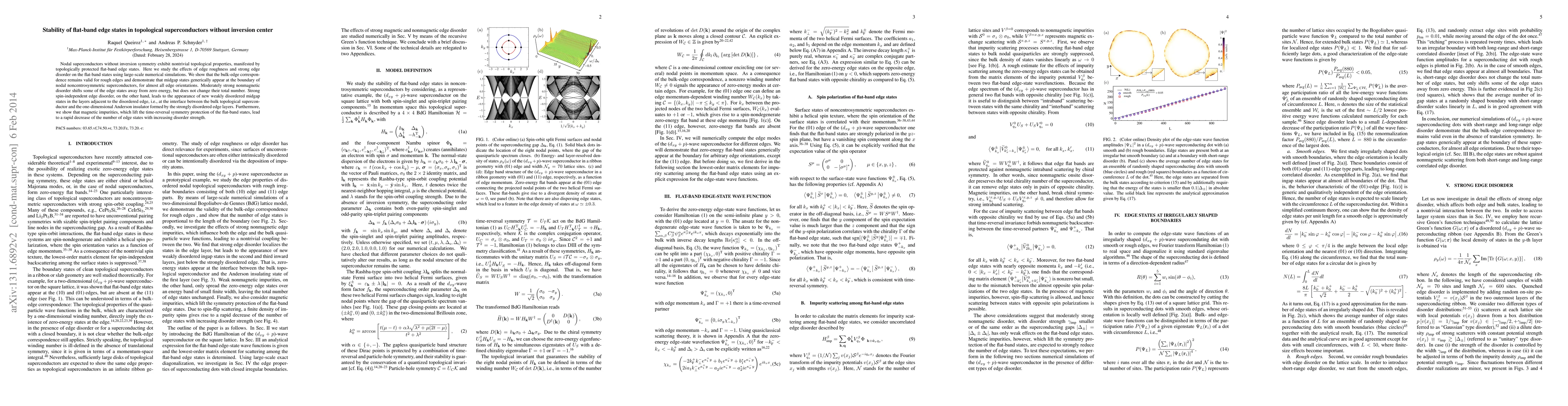 This paper investigates the stability of topologically protected flat-band edge states in nodal superconductors lacking inversion symmetry. It finds that bulk-edge correspondence persists despite edge roughness and disorder, but strong spin-independent disorder introduces new midgap states near the interface, while magnetic impurities rapidly reduce the number of edge states.