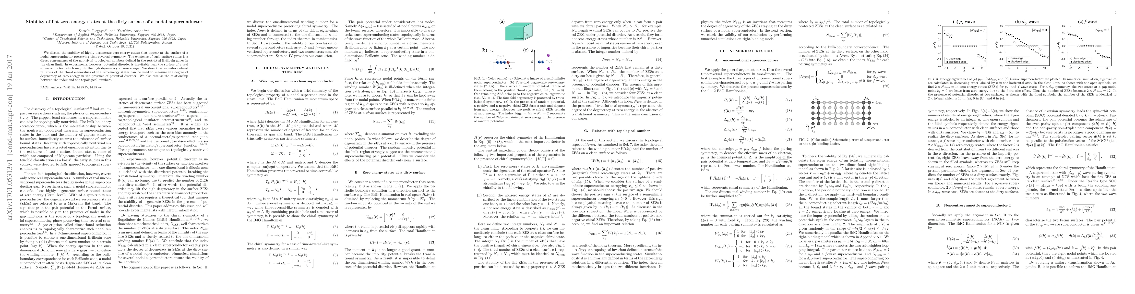 Researchers investigate stability of zero-energy states at a superconductor's surface with disorder, proposing an index to measure degeneracy and linking it to topological numbers.