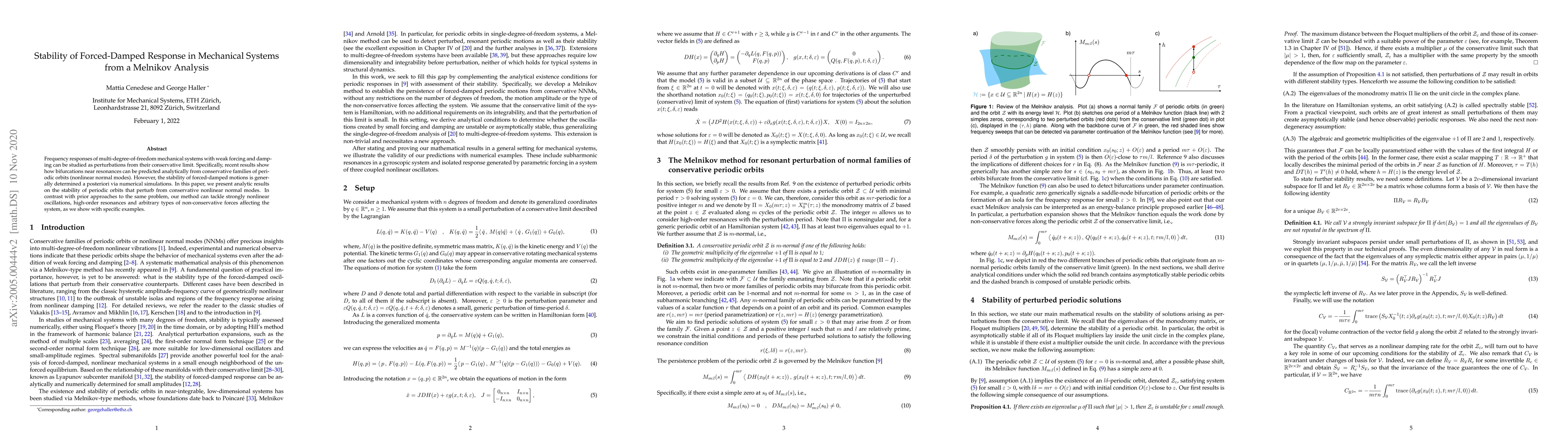 This paper presents an analytical method for predicting the stability of forced-damped periodic orbits in multi-degree-of-freedom mechanical systems using Melnikov analysis. Unlike previous approaches, it can handle strong nonlinearity, high-order resonances, and various non-conservative forces.