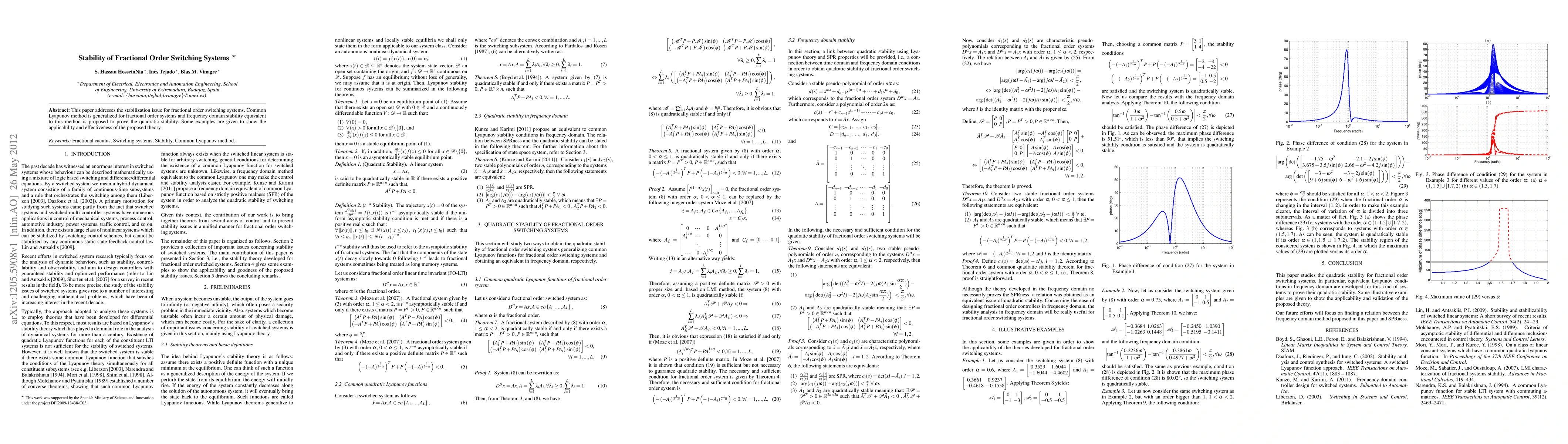 This paper generalizes the common Lyapunov method for fractional order systems and proposes a frequency domain stability equivalent to prove quadratic stability. Examples demonstrate the applicability and effectiveness of the proposed stabilization theory for fractional order switching systems.
