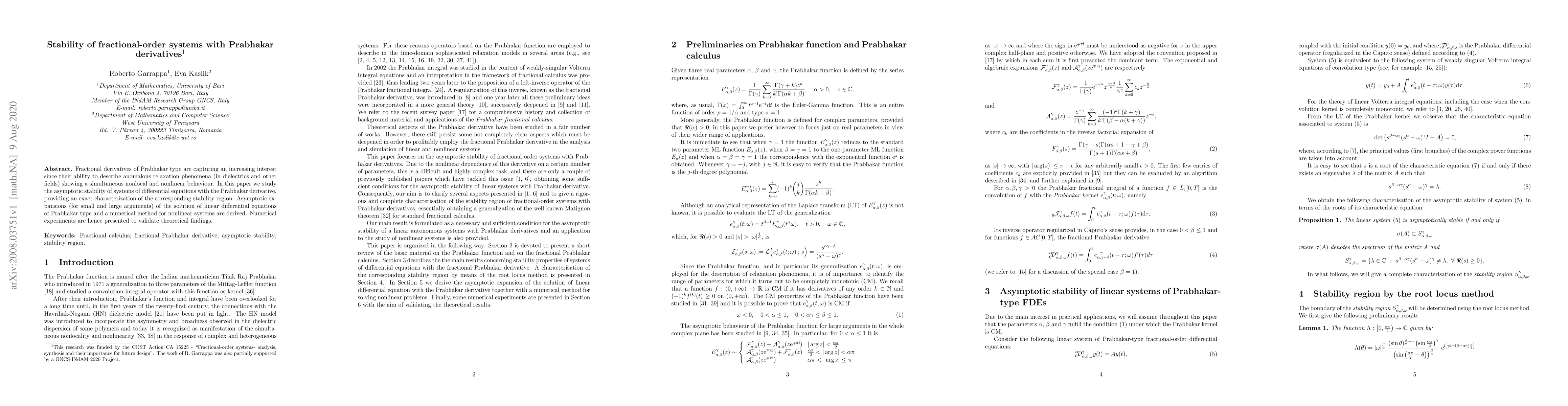 This paper explores the asymptotic stability of fractional-order systems using Prabhakar derivatives, providing an exact stability region characterization. It also develops asymptotic expansions and numerical methods for both linear and nonlinear systems, validated by numerical experiments.