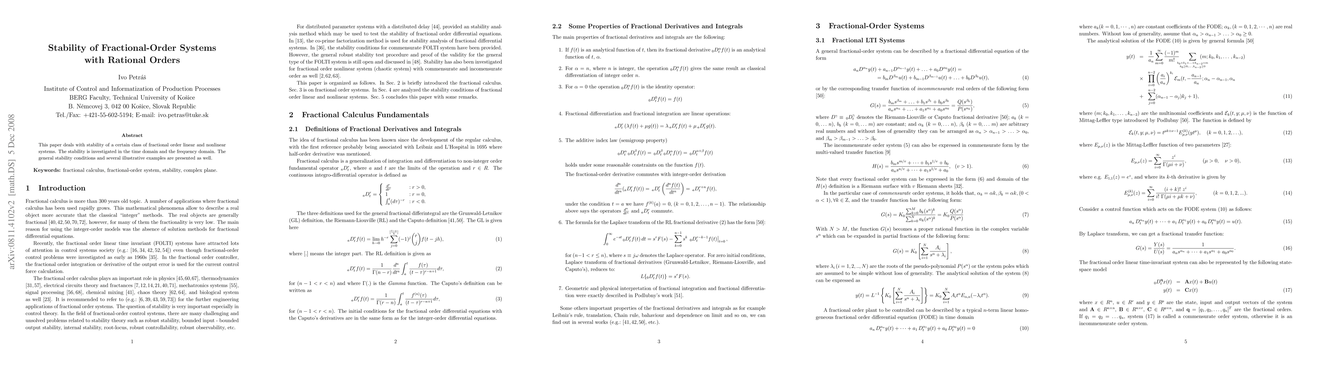 This paper deals with stability of a certain class of fractional order linear and nonlinear systems. The stability is investigated in the time domain and the frequency domain. The general stability conditions and several illustrative examples are presented as well.